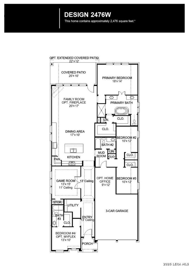 Extended entry with 13-foot ceiling leads to open kitchen, dining area and family room. Kitchen offers generous counter space, a 5-burner gas cooktop, corner walk-in pantry and island with built-in seating space. Dining area flows into family room with wall of windows. Game room with French doors. Primary suite includes double-door entry to primary bath with dual vanities, garden tub, separate glass-enclosed shower and two walk-in closets. Secondary bedrooms feature walk-in closets. Extended covered backyard patio. Landscape features a 6-zone sprinkler system. Mud room off three-car garage.