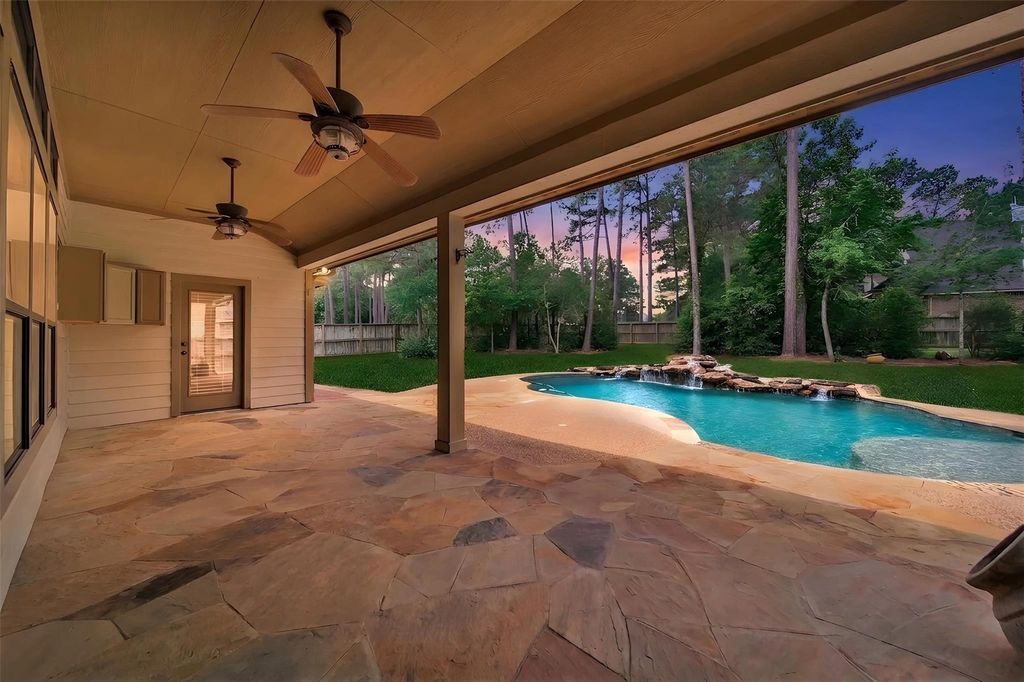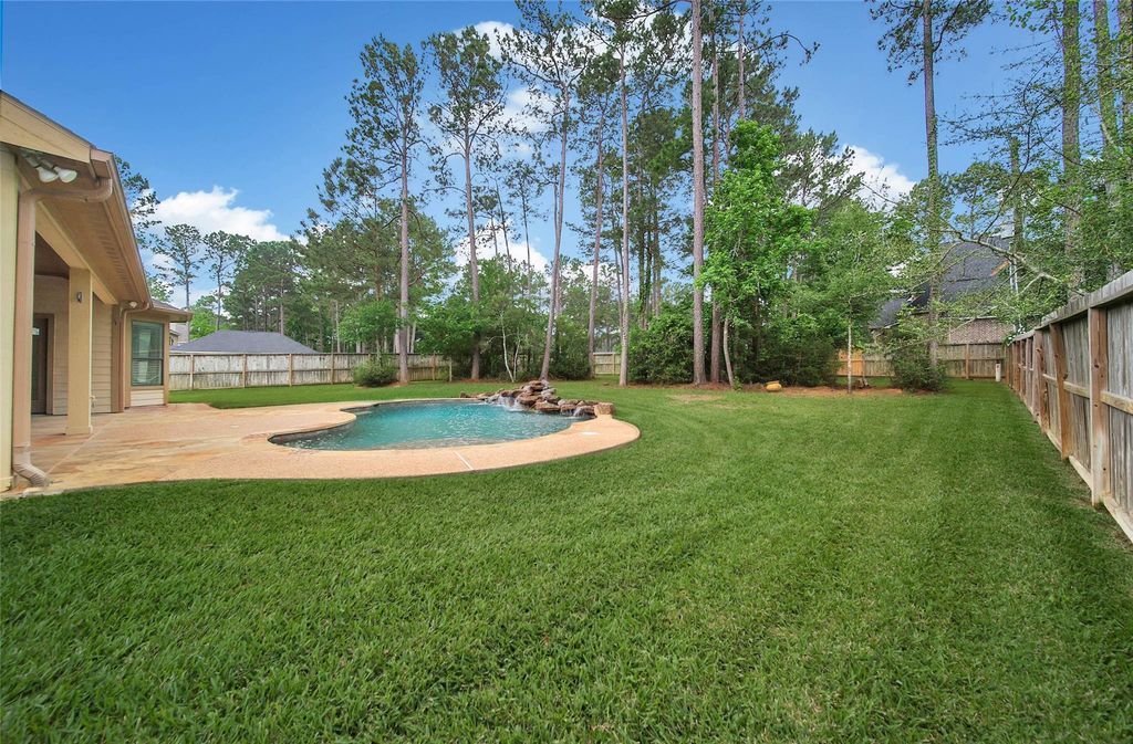 Welcome to Texas Living — a stunning 4,505 sq. ft. home offering space, style, and standout outdoor living on a desirable corner lot. This 4-bedroom, 3.5-bath home features a dramatic first floor with soaring two-story ceilings, beautiful hardwood floors, and an open layout designed to impress. The primary suite is conveniently located on the main level, along with a massive private office. The kitchen is beautifully equipped with 42” cabinets, SS appliances, family dining and a butler’s pantry, creating the perfect setup for entertaining. Upstairs, you’ll find a spacious game room and Media room, giving everyone room to relax, play, or gather. Outside, enjoy your own backyard retreat with a custom pool featuring waterfalls, plus a covered back patio with a gas line ready for your outdoor kitchen or grill. Additional highlights include a 3-car garage, low tax benefits with no MUD tax, and a prime location just about 15 minutes from The Woodlands and 13 minutes to the town of Magnolia.