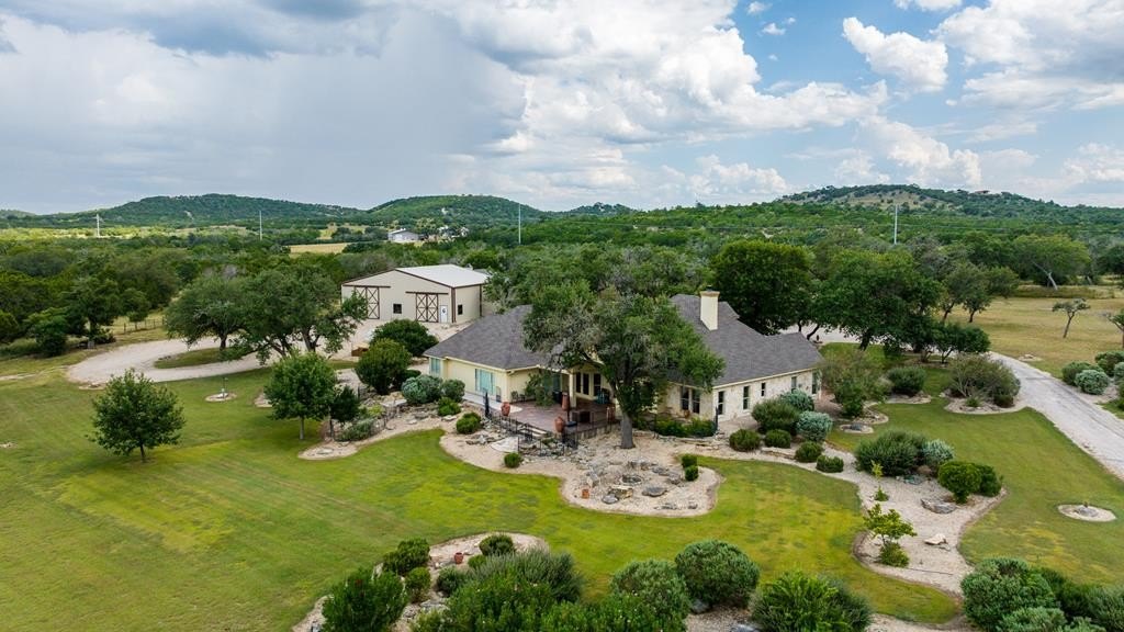 Discover the perfect Texas Hill Country retreat on 10 acres, thoughtfully designed for both comfort and functionality. This beautiful 3-bedroom, 2.5-bath home showcases custom craftsmanship throughout, featuring a stunning vaulted, beamed ceiling in the great room, rich pecan wood floors, custom cabinetry, granite countertops, and a striking limestone fireplace as the centerpiece. The spacious primary suite offers a true private escape, complete with double vanities, a relaxing garden tub, a walk-in shower, and separate, well-organized his-and-hers closets. Home also consists of a functional office that can be used as a 4th bedroom. A beautifully landscaped and manicured yard surrounds the home. Property includes a 4000+/- sq.ft Workshop with 2 roll out doors, Dog Kennels and custom cabinetry. A 100 gpm water well provides water for the home and offers plenty of production for stock pond or additional water features. Pride of ownership is reflected in the meticulousy well kept 10 acres that surrounds the home. Paso Creek subdivision is a highly sought development that offers electronic gate entrance, private paved roads and the beautiful Turtle Creek for fishing or swimming.