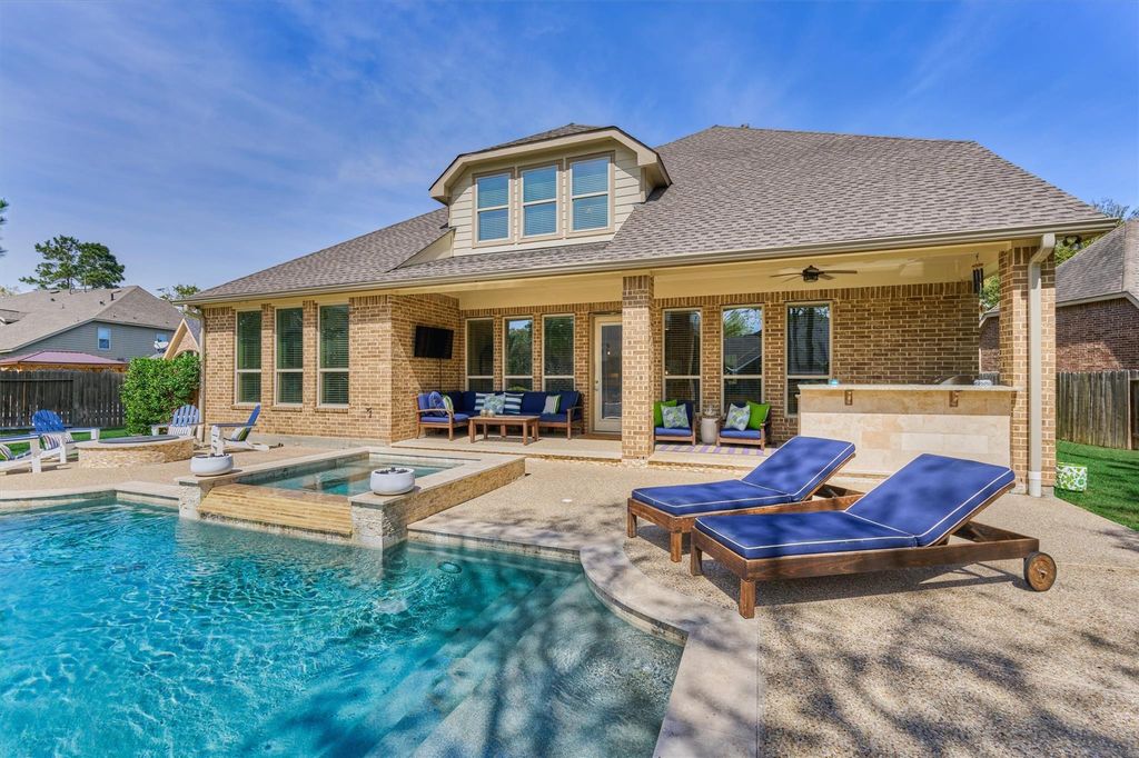 EXTRAORDINARY OPPORTUNITY IN THIS IMPRESSIVE 5 BR/4 FULL BATH floor plan showcasing a *brand new roof*, wood flooring throughout main living area, refreshed kitchen, supreme outdoor living area w/sparkling pool & spa, fire pit, summer kitchen, water softener, landscape lighting, MORE! Situated on an oversized cul-de-sac lot, this gem features 2 bedrooms down, enclosed office, formal dining, and inviting den w/soaring ceilings with stone surround fireplace, opening to a chef's kitchen w/abundant cabinetry, walk-in pantry & seamless flow into the breakfast area - all overlooking a picturesque backyard oasis! Secluded primary suite with generous space & spa-inspired bath! Oversized game room & 3 spacious bedrooms upstairs including a guest suite + bonus storage room! Utility/mud connects to true 3-car garage w/optimal storage & organization! Located in award-winning Woodforest community w/water & dog parks, nature trails, nearby shops/dining, close to The Wdlds amenities + Lake Conroe!