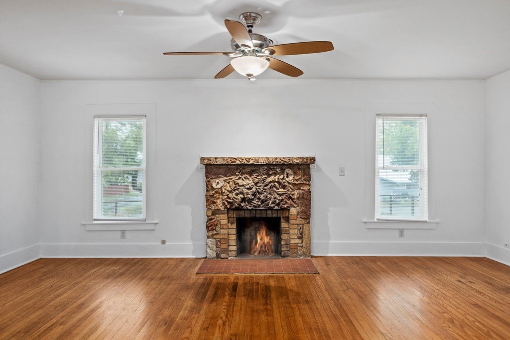 1940s home with original hardwood floors and period details that reflect the character of its era. The living and dining areas flow together in an open layout, anchored by a woodburning stone fireplace and filled with natural light. The kitchen offers a central gathering space with a large island, farmhouse-style sink, concrete countertops, dishwasher, and ample cabinetry, all with easy connection to the main living areas. Bedrooms are well-proportioned, and a loft-style space with ladder access provides a unique additional area that can be adapted to a variety of uses. High ceilings and thoughtful details throughout contribute to the overall feel of the home, while the layout offers flexibility for different living arrangements. Positioned on a level corner lot with city street access, the property also offers a desirable location-within walking distance to Tivy Stadium, the Guadalupe River, and Water Street, where local festivals and events bring the area to life. The home retains many of its original design elements alongside practical features for everyday living.