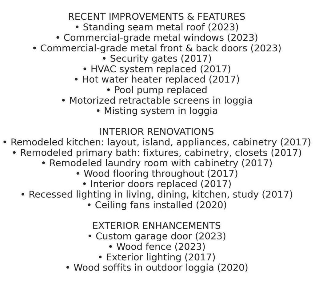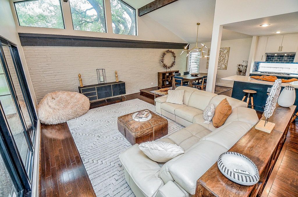 Thoughtfully reimagined midcentury home sits in one of the area’s most desirable neighborhoods, just moments from Town & Country Village and Beltway 8. The living spaces have been professionally opened and redesigned to create a soft, modern flow. Custom cabinetry and elevated finishes found throughout. Nearly every room looks onto the private central courtyard and shimmering pool, filling the home with natural light and a sense of calm. The primary suite offers a quiet retreat with his-and-hers designer closets and a remodeled bath featuring a soaking tub, separate shower, and double sinks. All doors have been replaced, with premium metal and privacy-glass designs enhancing the exterior entries. Additional baths pair new cabinetry and quartz countertops with preserved midcentury tile for character. A standing-seam aluminum roof adds style and longevity. The detached fourth bedroom with its own bath opens to the pool and serves beautifully as a guest suite, game room, or pool house.