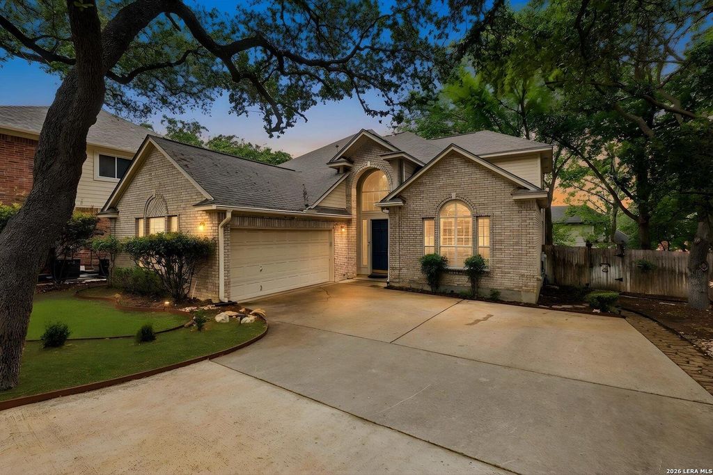 Lovingly cared for 2-story home in Olympia Hills with many mature oak trees. Downstairs features high ceilings, crown molding, plantation shutters, beautiful hardwood floors and a cozy fireplace. A great place for entertaining with two living areas and two eating areas. Gorgeous island kitchen with granite counters and custom cabinets. Fridge conveys. The primary bedroom has a spa-like bath with garden tub and separate shower, and a huge walk-in closet. The garage has an insulated door, utility sink AND an electric car charger! There is a shed out back with electricity. Fence replaced 2024. Walk to the neighborhood pool, clubhouse and tennis/pickleball courts! Also NO cluster mailbox!! Super convenient to I-35, 1604, IH-10, JBSA Randolph and Ft. Sam as well as Olympia Hills golf course, Forum shopping/restaurants, Costco and IKEA. Walk to the community pool, tennis/pickleball courts and Olympia elementary school.