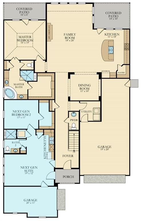The innovative two-story Acadia Next Gen® floor plan by Lennar features a unique dual living arrangement. A Home within a Home®, the private suite offers a separate and private front entry, living room, bedroom, full bath, handy kitchenette, and a garage bay. The main home features an inviting front porch and foyer entry, an island kitchen with walk-in pantry, formal dining room, walk-in utility room, a generous family room with the option to add a cozy corner fireplace, and relaxing covered rear patio. The master bedroom features access to an additional private covered patio, and an en suite bathroom with dual sinks, separate shower and corner tub, private toilet enclosure, and a large master walk-in closet.
