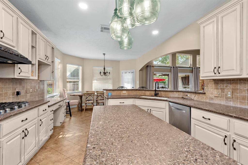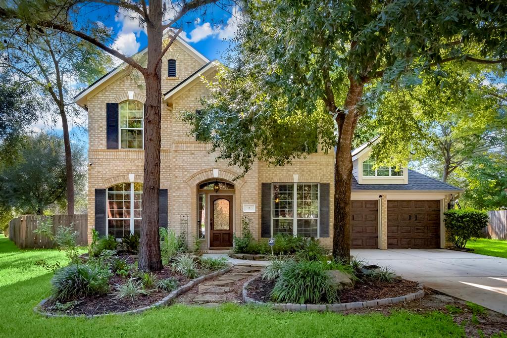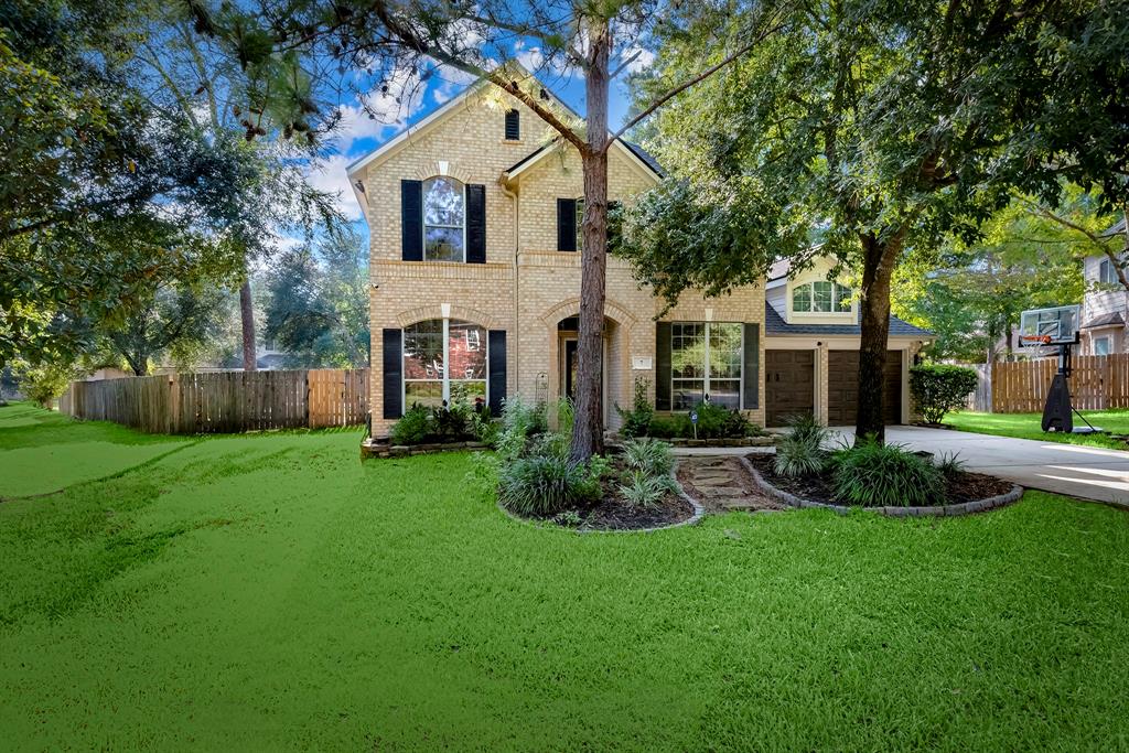 Bright & spacious, Emerald-built home situated on an oversized cul-de-sac lot. Backyard oasis boasts a sparkling pool & spa with waterfall feature, covered patio with built-in kitchen/grill area & mounted tv, fire pit & a good deal of lush, green space. Foyer has tray ceiling design & opens to formal dining room. New sound-barrier French doors open to the Study; office space provides tasteful built-ins. 2-story living room with floor-to-ceiling windows provide natural light throughout. Living area includes gas-log fireplace & opens to the kitchen, breakfast bar and additional dining space. 1st floor primary bedroom boasts bathroom ensuite & includes dual sinks, jetted soaker tub, large separate shower & walk-in closet space. 2nd story staircase opens to game room/flex space and 3 additional bedrooms. Stainless steel refrigerator & 1st floor washer and dryer included! Pool maintenance included! Zoned to Conroe ISD & The Woodlands HS.