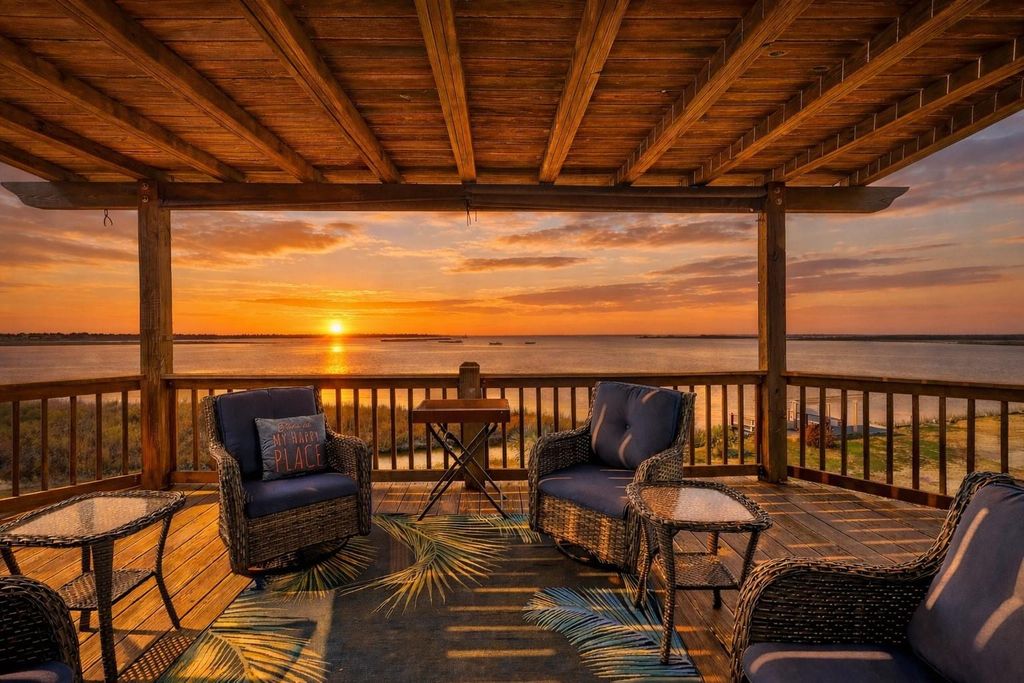The views of the sunset are amazing in this waterfront home on the bay. 1124 Faggards Road is a 3-bedroom, 3-bath elevated coastal retreat positioned on almost 2 acres of paradise with expansive bay and canal frontage. A private lift provides convenient access to the main living level, where vaulted wood ceilings, rich wood flooring, and walls of windows frame stunning water views. The open-concept living, dining, and kitchen area is designed for gathering, featuring granite countertops, stainless steel appliances, custom cabinetry, and a generous breakfast bar. Wraparound balconies offer outdoor living and sunset views, while the private dock provides direct access for fishing, boating, and kayaking. The property also includes covered parking, garage space, and a detached shed. The property is also equipped with storm-ready roll-down storm shutters and a generator. This is a rare opportunity to own a true waterfront lifestyle property. Call today to schedule your private showing.