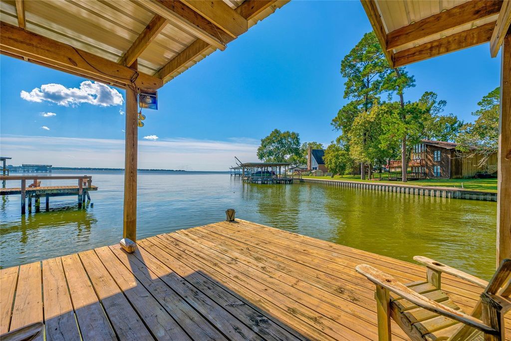 Brick waterfront in very desirable location on Lake Livingston with great views of the lake. In the Indian Hill Subdivision with 4 bedrooms with two full baths. Primary bedroom features two closets, a soaker tub with Marble walls, and a vanity area. Kitchen features large island and two large pantries. The living room features a wood-burning fireplace, with a wood storage cubby to store your wood. Indoor sunroom with large windows. Outside is screened porch with a large wooden deck. Large wooden bulkhead and jet ski double lift. Storage building. Shared water well, with no water bill. Come see this one today!
