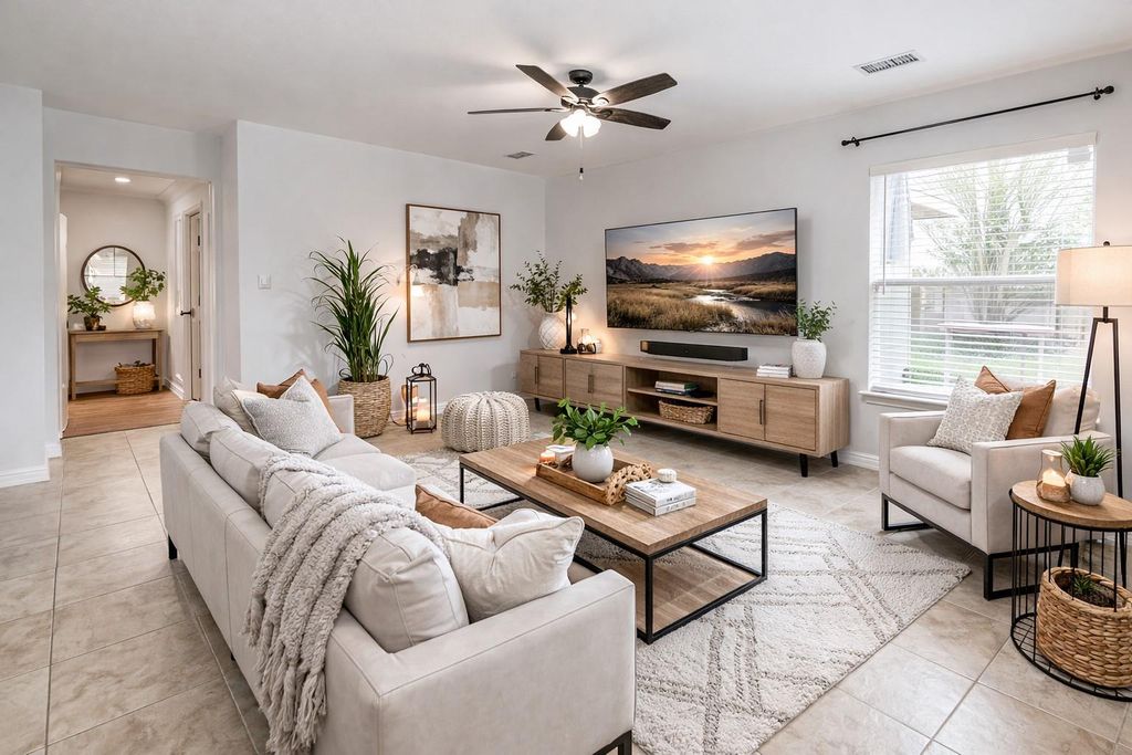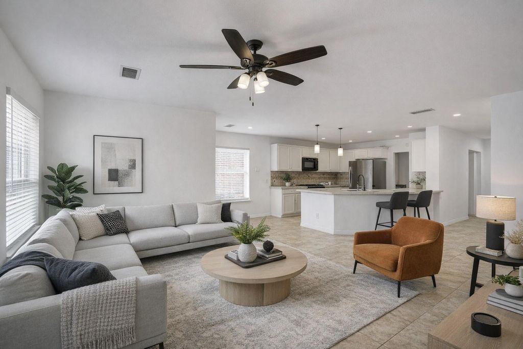 Discover this beautifully designed open-concept home, ideal for both everyday living and entertaining. The expansive kitchen seamlessly flows into the spacious living area, creating an inviting environment with clear sightlines throughout the main gathering space. The generously sized primary suite easily accommodates a king-size bed along with additional furnishings, and features a spa-inspired bathroom complete with a soaking Epsom salt tub and a rejuvenating walk-in shower. Step outside to your private backyard retreat with no rear neighbors—offering peaceful blue-sky views and added privacy. Conveniently located near two major freeways for easy commuting, this home also features two well-sized secondary bedrooms and an additional full bath, perfect for family or guests.