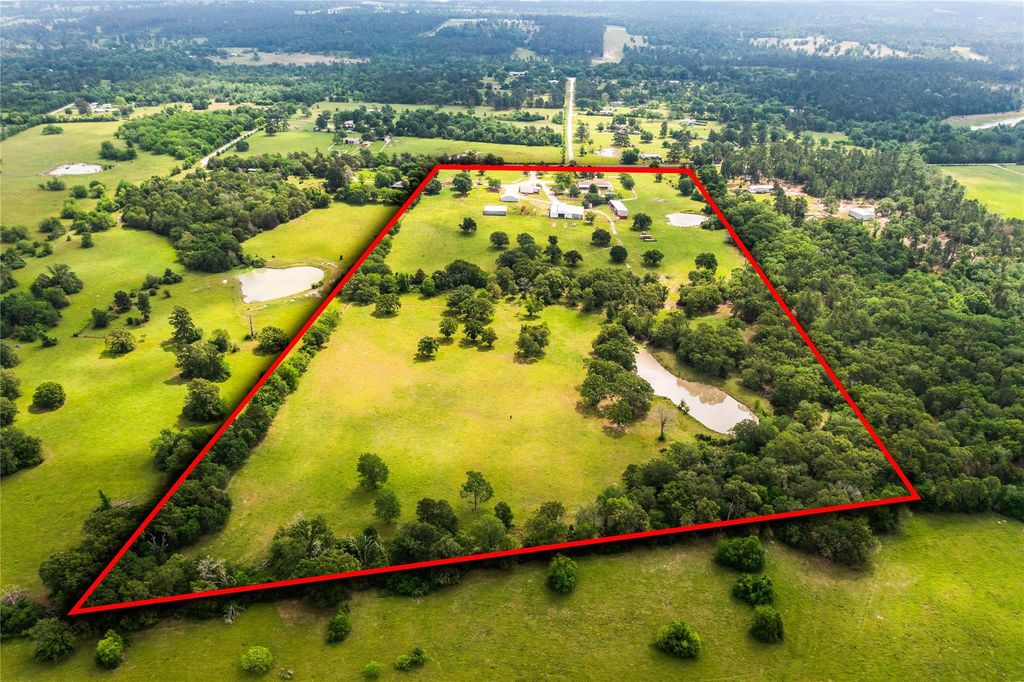 Well-maintained 40-acre ranch in Bedias offering an ideal blend of comfort, functionality, and country appeal. The 4-bedroom, 3-bath brick home spans 2,709 SF and features tall ceilings, abundant natural light, and a gas log fireplace. The land is cross-fenced and set up for livestock with working pens, improved pasture, and two scenic ponds that provide both beauty and practical water for cattle or horses. Multiple shops and outbuildings offer excellent space for equipment, storage, projects, or ranch operations. An automatic gate, attached garage, attached carport, water well, county-maintained road frontage, and unrestricted use add to the property’s versatility. Well suited for cattle, horses, recreation, or full-time country living.