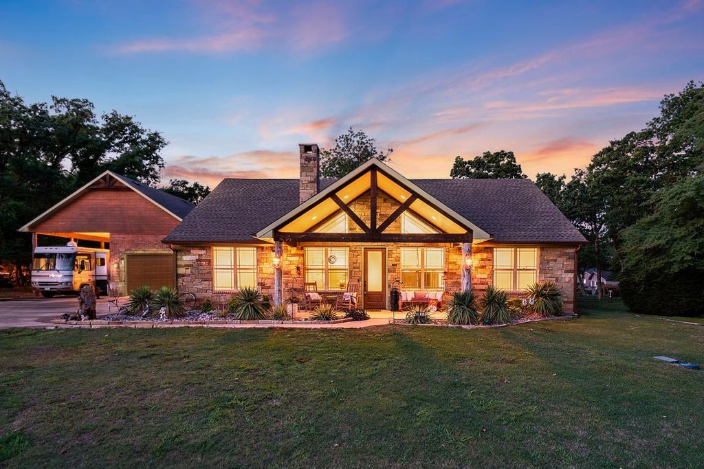 Beautiful custom built home with stunning water views, featuring 4 bedrooms and 3 baths on two quiet lots in a desirable gated community. This spacious home showcases Oklahoma stack stone, tile floors, a vaulted ceiling, cozy fireplace, and rich woodwork throughout. The kitchen includes an island ideal for gathering, while sliding barn doors add character and charm. A large two-car garage and covered motorhome parking with utility hookups provide plenty of space for vehicles, hobbies, and storage. The fenced backyard is perfect for relaxing or entertaining, complete with a covered porch and a gorgeous gazebo. Strong curb appeal shines with a covered front porch and tasteful landscaping. Seller offering $10,000 in concessions toward buyer’s closing costs, adding exceptional value to this remarkable property that blends privacy, elegance, and scenic water views.