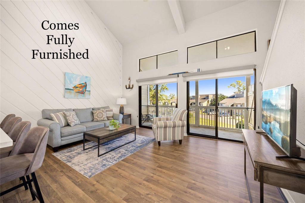 Welcome home to 108 April Point Dr S in the gated April Sound community on Lake Conroe! This charming 2-story condo comes FULLY FURNISHED and features 2 bedrooms, 1 full bath, and is perfect for full-time living, a weekend getaway, or a vacation rental investment. The main level offers a welcoming foyer, dining area, and a bright living room with large windows and balcony access. The kitchen sits at the center of the home with plenty of cabinet and counter space. The primary bedroom is conveniently located on the first floor with direct access to the bathroom and a walk-in closet. Upstairs you will find a spacious second bedroom with an open loft-style layout overlooking the living area. Enjoy low-maintenance living close to the lake, golf, dining, and all the amenities April Sound has to offer. Schedule your showing today!