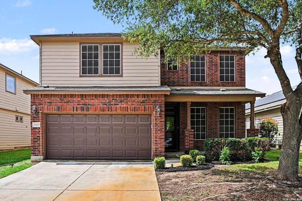 Welcome to 5409 Caraway Bend in The Ridge at Leon Valley. This well cared for Tri-Stone home offers 3 bedrooms, 2.5 baths, and 2,260 square feet of comfortable living space. The layout gives you room to spread out while still feeling connected. The kitchen features 42 inch cabinets, updated appliances, and a recently replaced sink, opening into the main living area with crown molding that adds a nice touch. Downstairs was painted a few years ago and has been well maintained. You will notice right away that this home has been taken care of. Major updates include a roof replaced in 2017, a 50 gallon water heater replaced in 2025, and an air handler that is about 7 years old. The HVAC, stove, and water heater are all electric. Energy efficiency features include double pane windows, solar screens, and a radiant barrier in the attic. The home also has a water softener in place. Flooring is laminate and tile throughout, with carpet only in the primary closet. Ceiling fans are installed in ev