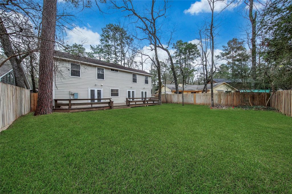 FABULOUS, home in the heart of The Woodlands "Panther Creek". Light and bright spacious open floor plan with two-story high ceilings. Home is in immaculate condition. Family room has gas fireplace. Luxurious dolomitic marble countertops in kitchen & bathrooms. European hardwood inspired porcelain tile floors in kitchen, dining & living area. Two sets of french doors in the kitchen and dining area open to a beautiful 46x11 stained wood deck with built-in seating. All stainless appliances, refrigerator included. Master has a set of french doors that open to the wood deck. Elfa adjustable custom closets in kitchen & master. Large peaceful fenced in backyard. This home is conveniently located just minutes from The Woodlands medical hub, The Woodlands Park and Ride, Exxon Mobile, shopping, restaurants, parks and The Woodlands High School. Never Flooded!