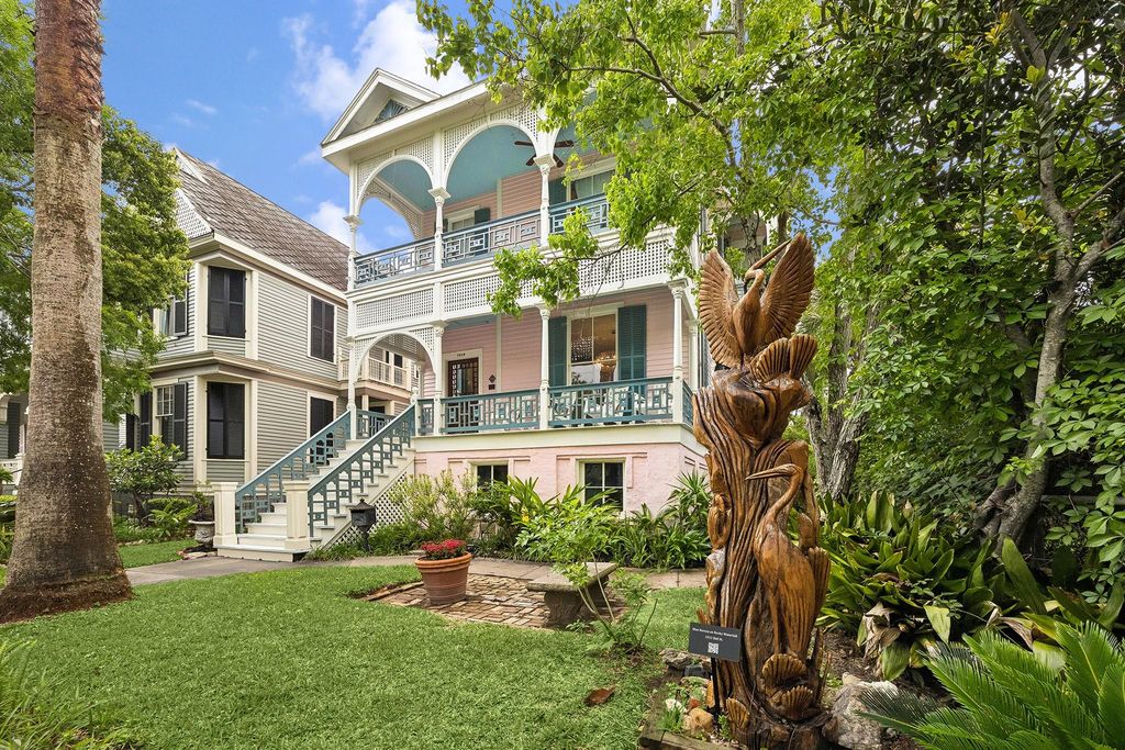 Published in the Galveston Architecture Guidebook, this grand Victorian home in the East End Historic District is filled with character & features both vintage features as well as modern updated conveniences. In 2023, the current owners opened walls between living & dining exposing the original brick fireplace & creating a definite wow factor. This open living area features a kitchen w/quartz counters, stainless appliances & copper apron sink. The primary suite is on the first floor & features wood floors, built-ins & a stunning renovated bath w/new cabinetry, quartz counters & more. A powder room was also added downstairs for the convenience of guests. Refinished maple floors, high-end lighting & gorgeous millwork are other features of this home. There is even a restored tree sculpture in the front yard that is published & part of the Galveston Tour of Sculptures visited by vacationers, segway tours & horse drawn carriages. Fabulous location close to both the Seawall & Strand area.