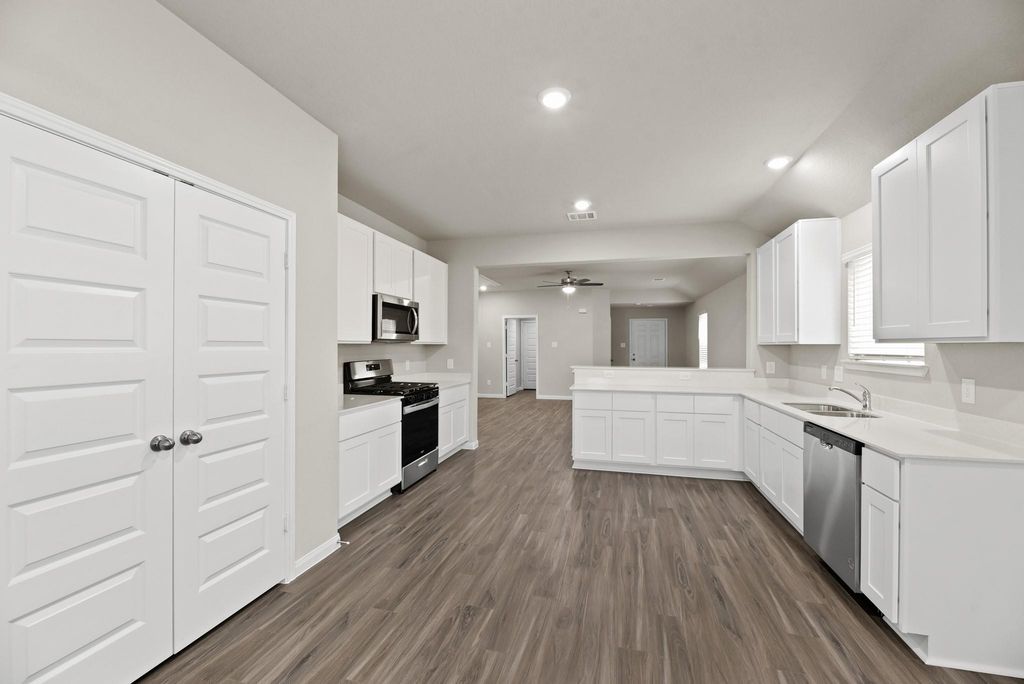 Welcome home to Ridgeland Hills in Willis, TX! Conveniently located off I-45, this vibrant community features a stunning pavilion, resort-style pool, large playground, and a scenic boardwalk along the water for fishing—perfectly blending recreation and relaxation. The Grove floor plan is a charming one-story home with 3 bedrooms, 2 bathrooms, and a 2-car garage, thoughtfully designed for comfort and functionality. Inside, vinyl plank flooring flows throughout the common areas, complemented by included privacy blinds for added convenience. The gourmet kitchen is sure to impress with 42-inch cabinets, quartz countertops, and stainless-steel appliances. Retreat to the oversized Owner’s Suite featuring double sinks with quartz countertops, an extended shower, and a spacious walk-in closet. Step outside to enjoy the covered patio and outdoor living. This beautiful new home blends modern finishes, functional design, and everyday comfort!