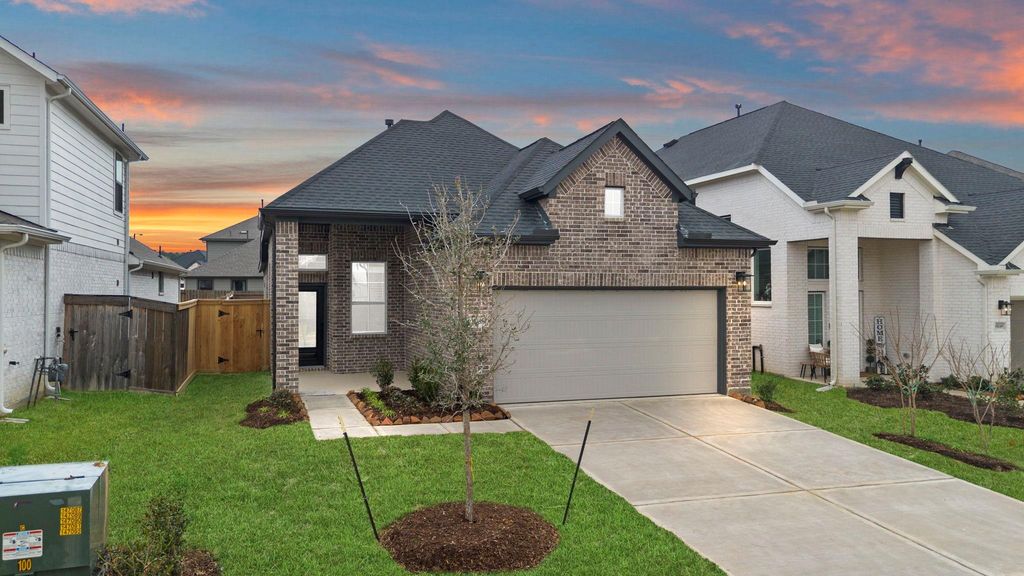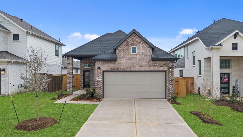 The Berkeley Plan -If simplicity is what you’re looking for but you don’t want to sacrifice modern day amenities, then this home is the one for you! 4 sides brick. Huge covered front porch & back patio w/ gas line for future grill. Light and bright interior features include wood look ceramic tile flooring throughout , 5” baseboards & tall ceilings with an abundance of natural light. The kitchen offers 42” white cabinets with gold hardware, undercabinet lighting, tile backsplash, light quartz countertops, stainless steel appliances, a farmhouse style sink & large island with plenty of storage. The primary retreat has both a separate tub & shower.  In addition, this home also includes full sprinklers, garage door openers, a tankless water heater, 2” faux wood blinds & so much more.