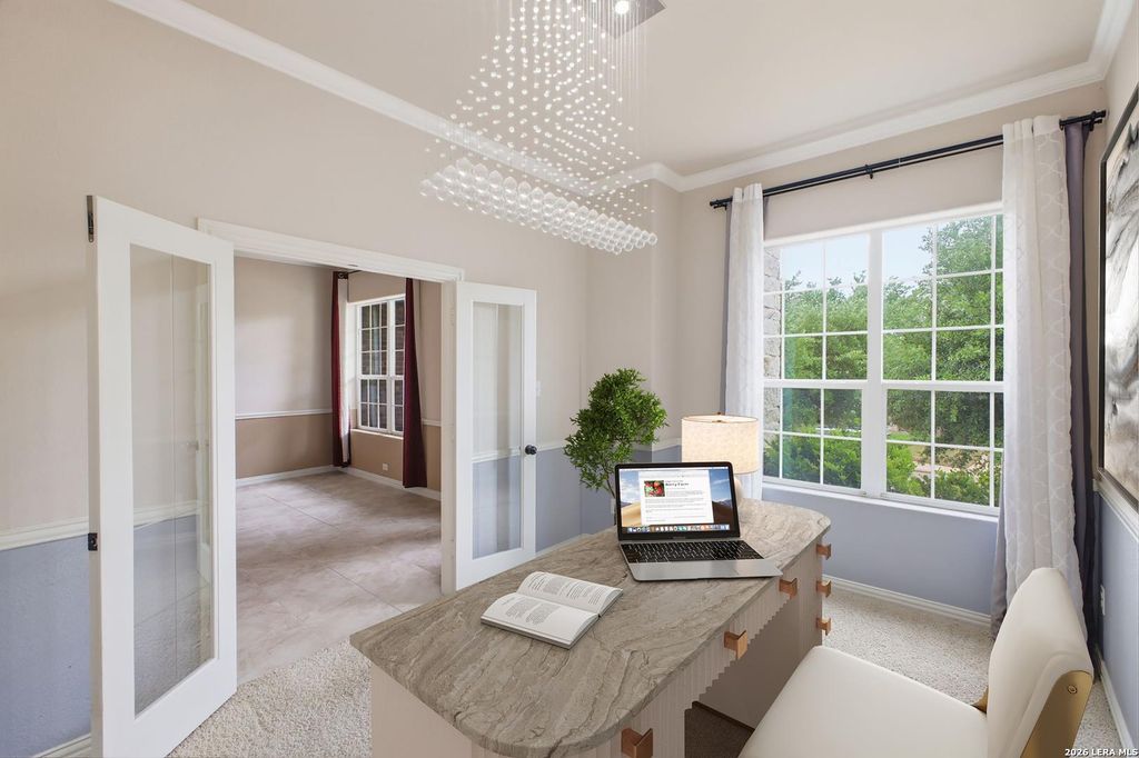 Your Move Up Home in The Preserve at Indian Springs*Sip your morning coffee and catch up on the news on your I-pad on your covered front porch*Prepare gourmet meals in open floor plan kitchen with granite countertops and island and gas cooking stove*Host holiday meals in dining room at the front of the home*Entertain guests in the living room*Relax after a long day in the primary bedroom with high ceilings*Refresh in primary bath with separate garden tub and shower, dual vanities, and walk in closet* Work from home in office at the front of the home*Flex room in the middle of the home can be used as home theater, game room, or play room*Enjoy afternoon BBQs on covered back patio with .21 of an acre lot*3 car garage is ready to house your sports car collection*Spend quality time with loved ones at community pool, park/playground, jogging trails, pickle ball court*Comal ISD-Indian Springs Elementary is behind the home at the entrance of the subdivision*Golfers-enjoy a round at the cours