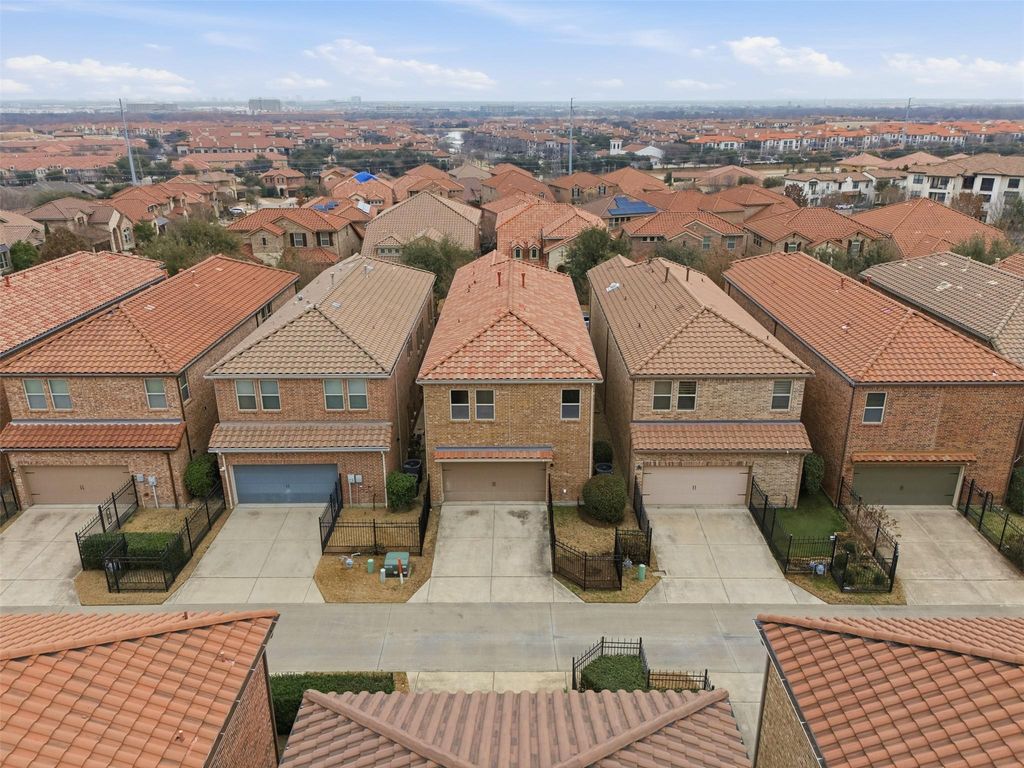 Beautifully designed home in the highly sought-after Villas of Escena offering modern elegance, functionality, and low-maintenance living in a prime central metroplex location. An airy open floor plan is filled with natural light from expansive windows and highlighted by soaring ceilings and rich hardwood flooring that create a warm, inviting atmosphere. The spacious living area flows seamlessly into a chef-inspired kitchen featuring a large island, granite countertops, stainless steel appliances, a gas cooktop, and rich cabinetry, ideal for everyday living and entertaining. The versatile layout includes a first-floor bedroom with a full bath that can easily serve as a private office or guest suite. Upstairs, you will find generously sized secondary bedrooms, a loft-style flex space, and a large primary suite entered through double doors and finished with hardwood flooring. The oversized primary bath features a soaking tub, separate walk-in shower, and a large walk-in closet, creating a true private retreat. The HOA provides exterior landscape maintenance and neighborhood security patrol for true lock-and-leave convenience. Ideally located near parks, Campion Trails, the Las Colinas Entertainment District, Toyota Music Factory, and major business hubs, with convenient access to DFW and Love Field airports, this home delivers comfort, accessibility, and lifestyle all in one.