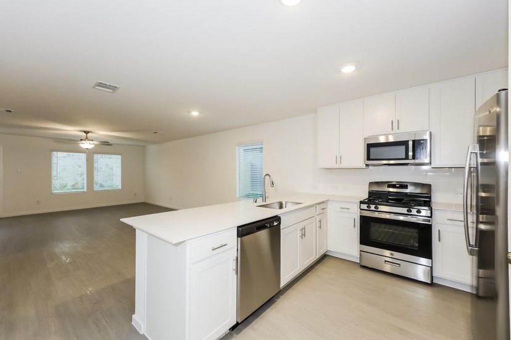 Be the first to live in this brand new home in the 30 West Luxury Rental Homes community in beautiful Fort Worth! The Ponderosa floor plan features four bedrooms and two bathrooms with 1707 sqft of modern living space. The open floor plan boasts a fabulous kitchen with upgraded stainless steel appliances including a gas range oven. The living room and dining area offer the perfect space for relaxation and entertaining. The primary bedroom has a view of the backyard and has an attached bathroom and walk in closet. The additional bedrooms share the large second bathroom. The separate laundry room comes equipped with a washer and dryer attached two car garage. Fantastic fenced in backyard.
