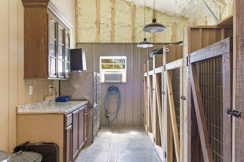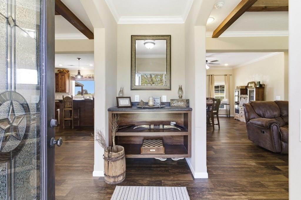 7.28 acres thoughtfully set up for self-sufficient living with room for livestock, hobbies, or business. This 4BD/2BA home offers an open layout with exposed beams, a wood-burning fireplace (gas hookup), and oversized windows with transoms throughout. The kitchen features a large island with seating, stainless appliances, pot filler, and a view overlooking the pastures. A spacious primary suite offers a large walk-in closet and a spa-like bath with jetted tub, oversized walk-in shower, and dual vanities. Layout also includes a foyer entry, formal dining, a versatile flex space, and a utility room with sink and storage. French doors open to a back deck overlooking a fully fenced yard with electric gate, cross-fenced pastures, chicken coop, multiple shops
