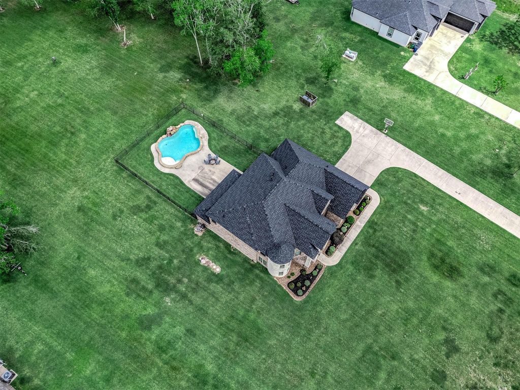 33207 Blue Marlin Dr is listed for sale at $ 750,000. The Single-Family property has 6 bedrooms, 3 Full Bathrooms, 3677 square feet and was built in 2014. The lot size is 2.055 Acres. ##BR##Sitting on 2+ acres with a pool in Oakwood Shores - offering space, flexibility, and an elevated lifestyle. A 5-6 bedroom home featuring primary suite + additional room w/full bath downstairs. This layout is the epitome of flexible, whether you need several bedrooms, 2 studies, a media room, room for in-laws, college kids, or 2 work-from-home professionals. Unique and classy features include wine room, primary closet with direct access to the utility room, rounded turret dining and study. Designed for comfort and entertaining w/formal dining, game room/loft, media room with in-ceiling speakers (equipment and TVs convey). The kitchen has a pot filler, butler’s pantry, large island, and opens to a living room with stone fireplace, high ceilings, and wrought iron staircase. Enjoy a private backyard with sparkling pool. Major updates include roof (2025), HVAC (2023), pool equipment (2025), paint and flooring (2023). Don’t miss the wine room, generator plug, and community access to Bastrop Bayou.