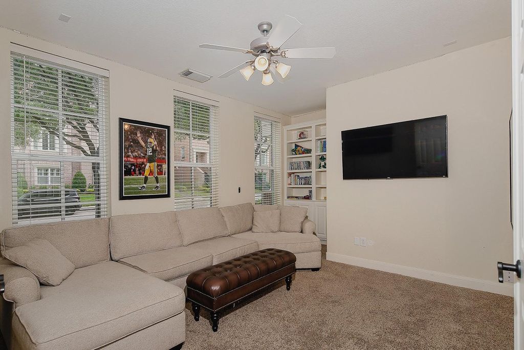 Corner townhome for lease in East Shore! With walkability to shops and restaurants along Woodlands Waterway and Town Center, a clubhouse with pool and fitness center, and close proximity to I-45 and area hospitals, East Shore's location is incomparable! 1st floor has a flex room with full bath; main living on the 2nd floor features an open concept island kitchen with granite counters, stainless steel appliances, gas cooktop, double ovens and pantry, overlooking the den with gas fireplace and breakfast room lined with windows. There's also a study with French doors and a half bath for guests on this floor. 3rd floor primary suite with balcony and two guest bedrooms with full bath, as well as a utility room. Wood flooring in the main living areas and neutral carpet in the bedrooms. Equal deposit; current credit report with scores required. No Pets & No Smokers Allowed!
