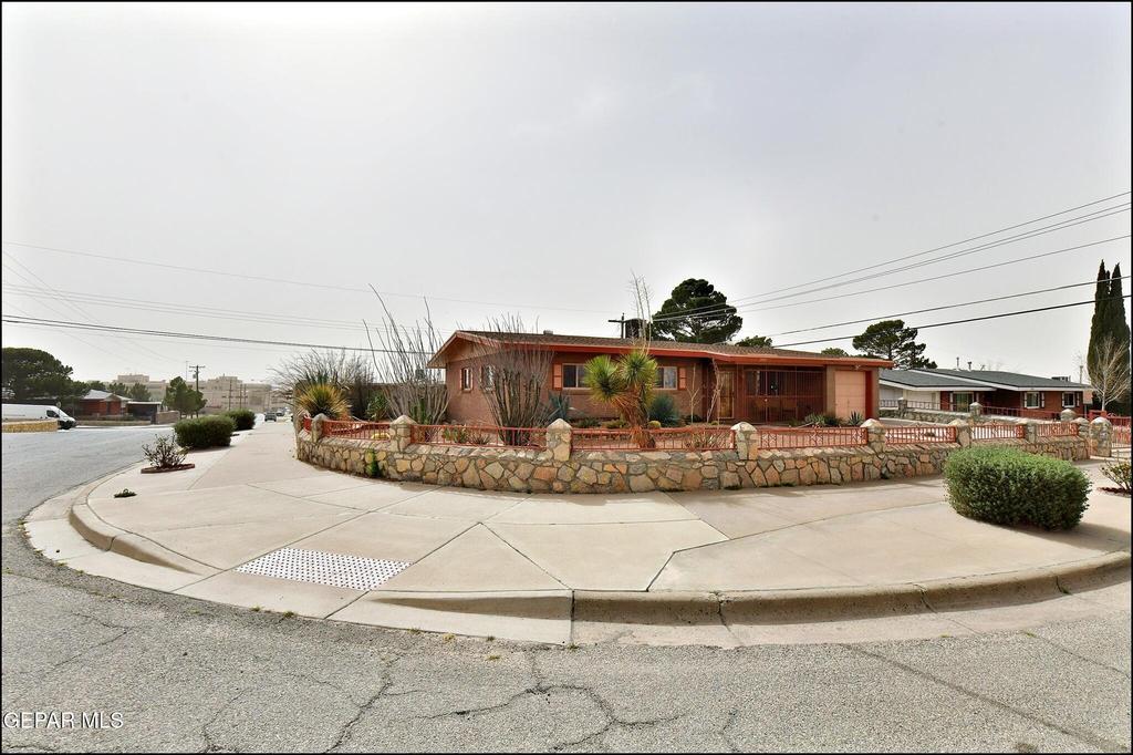 A private backyard oasis sets the tone for this 3 bedroom, 2 bath home with a sculpted pool, integrated spa, and desert landscaping bordered by stone walls. The covered patio provides shaded outdoor space while the curved pool deck encourages relaxed gatherings. Indoors, polished hardwood flooring enhances the entry and living spaces, while tile transitions lead into a thoughtfully updated kitchen with dark wood cabinetry, mosaic backsplash, stainless gas stove, and black refrigerator. The adjacent living area features a rounded brick fireplace and built-in bar with wood panel detailing for added character. Both bathrooms present tiled surrounds and updated fixtures, maintaining a cohesive aesthetic. Positioned near Franklin Mountains State Park and minutes from Cielo Vista, the location offers access to recreation, retail, and dining. Deposit-Free Renting service to Obligo qualified renters, fees may apply.