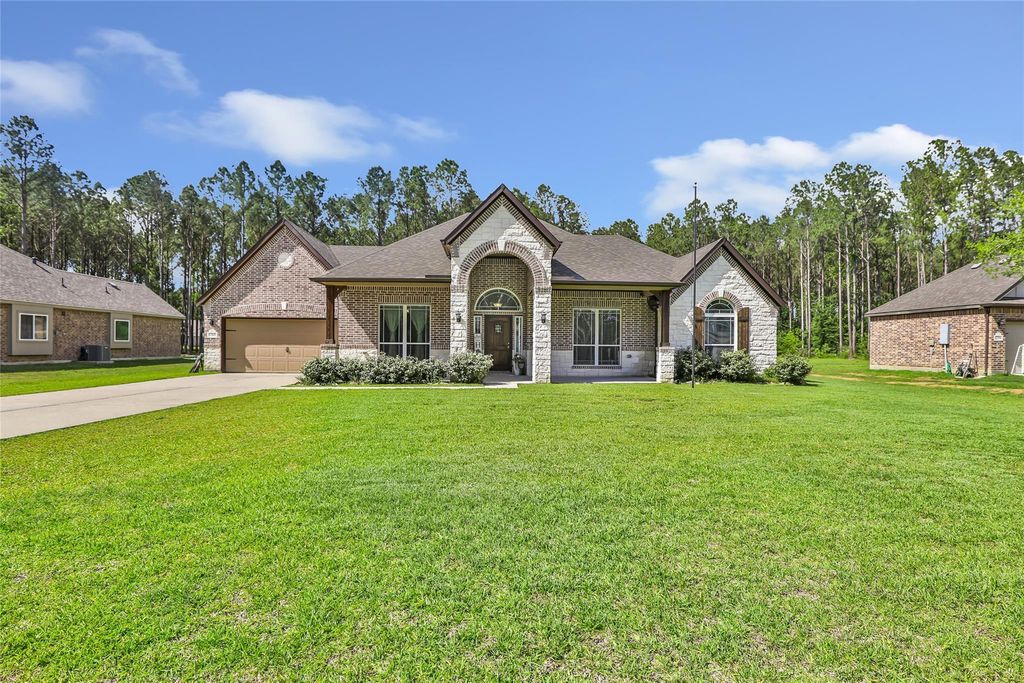 Welcome to sought-after Encino Estates in Dayton, Texas—where comfort meets style in this beautifully maintained, two-year-old home. Situated on a spacious lot, this property offers room to breathe while still enjoying a warm, inviting neighborhood feel. Step inside to soaring high ceilings and an open-concept layout designed for both everyday living and effortless entertaining. The kitchen flows seamlessly into the living and dining areas, featuring a cohesive blend of colors and finishes that create a clean, modern yet cozy atmosphere. At the heart of the home, a gas fireplace adds the perfect touch of warmth and charm. This thoughtfully designed home combines newer construction with timeless appeal, offering both functionality and comfort in every space. Whether you’re hosting guests or enjoying a quiet evening in, this home delivers the ideal setting.