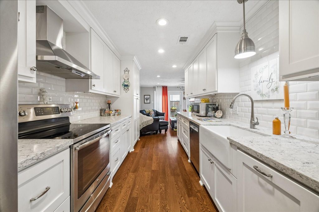 Tucked within a quiet, gated community near the Galleria, this exceptional residence stands apart with high-end finishes and elevated design throughout. Extensively remodeled in 2017, the home showcases refined craftsmanship, including updated doors and windows, custom trim and crown moulding, designer lighting, plantation shutters, and a fully reimagined kitchen and baths with upscale finishes. Rich wood flooring flows throughout the main living areas, adding warmth and sophistication, while custom closet built-ins enhance functionality. Positioned toward the back of the community, the home overlooks a park-like lawn and enjoys access to a private pool exclusive to the gated section. The light-filled open layout extends to a private patio with two covered parking spaces just steps away. The HOA covers electricity, water, and exterior maintenance for effortless, lock-and-leave living. Zoned to desirable SBISD schools.