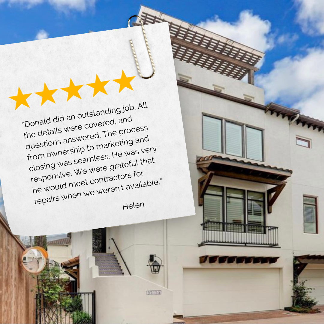 “Donald did an outstanding job. All the details were covered, and questions answered. The process from ownership to marketing and closing was seamless. He was very responsive. We were grateful that he would meet contractors for repairs when we weren’t available."