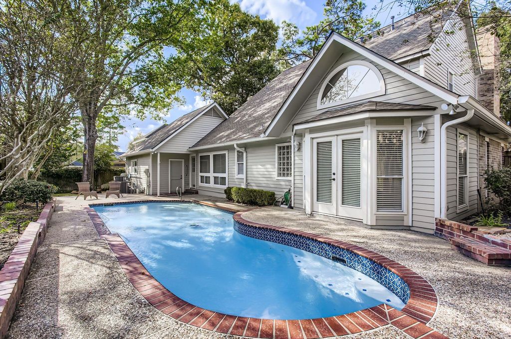 Sit back and relax on your charming front porch, peering toward the beautiful pond that is only steps away at the end of the cul-de-sac. This custom-built Weaver home features wood floors, a gas log fireplace, wet bar, and built-in cabinetry in the living areas. The kitchen and breakfast combo offer ample room to gather and plenty of storage space with beautiful built-ins. The primary bedroom downstairs has an attached home office/extended room and a remodeled bath with a huge walk-in shower. Step out to a private pool oasis in the backyard and enjoy a staycation every day. Newer A/C units, cooktop, windows, paint, carpet, PEX piping, and a new roof in 2025. Don't miss out on this beautiful home in one of the best locations in Kingwood!