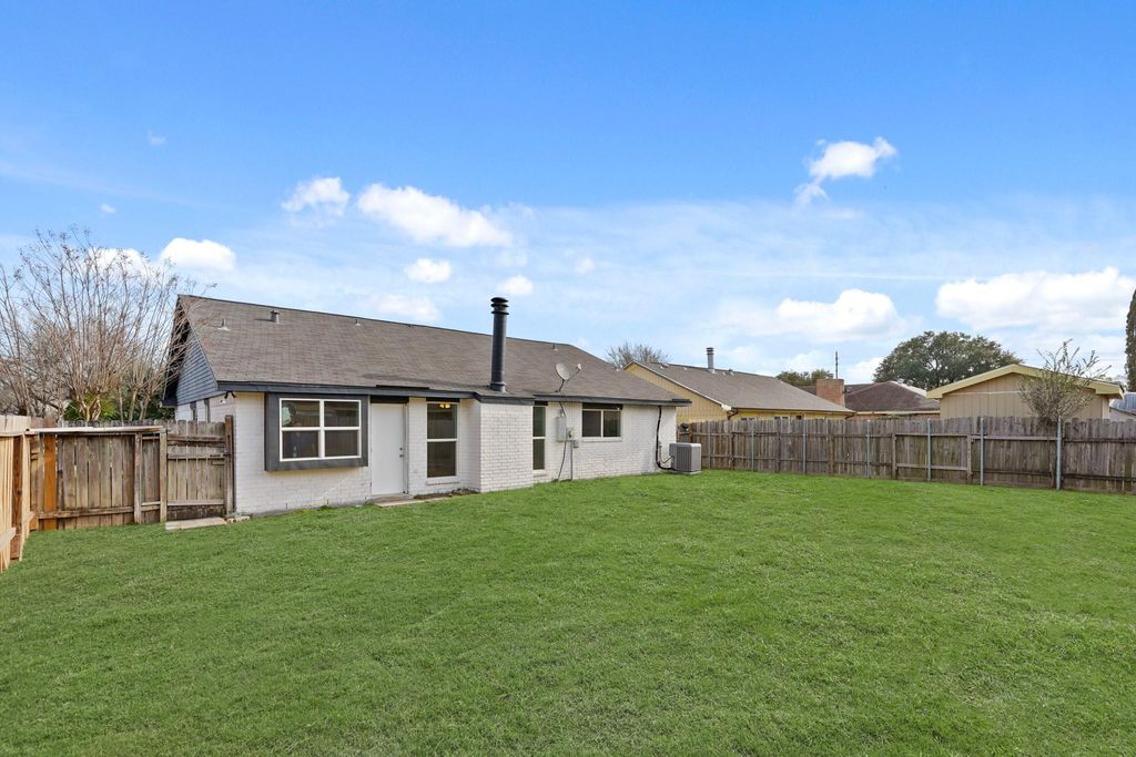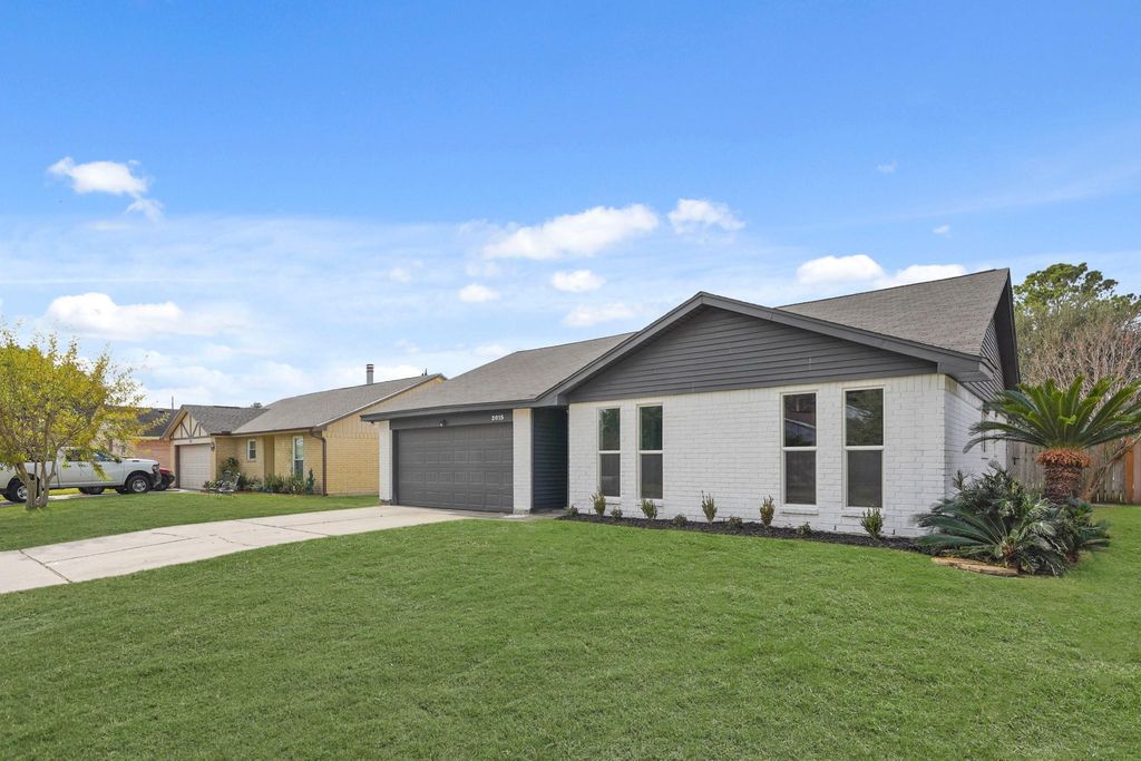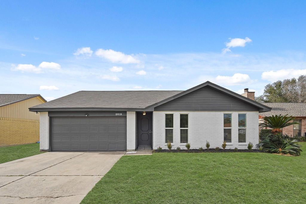 Welcome to 2015 Ridge Hollow Drive! This well-maintained single-story home offers 1,433 sq ft, 4 bedrooms, 2 baths, and a 2-car garage. The front yard features a spacious lawn with great curb appeal. Inside, two front bedrooms are bright and versatile with tall windows, neutral finishes, and ceiling fans—ideal for guests or a home office. The spacious living room showcases engineered wood-style flooring, and a classic brick fireplace, with large windows that bring in abundant natural light and backyard views. Recessed lighting and a ceiling fan add comfort and functionality. The adjacent dining area offers easy flow to the kitchen and outdoor space, perfect for everyday living and entertaining. The primary bedroom provides a relaxing retreat with backyard views and an ensuite vanity featuring granite countertops, white cabinetry, and ample storage. The fully fenced backyard offers an open lawn ideal for outdoor activities, relaxing, or future landscaping.