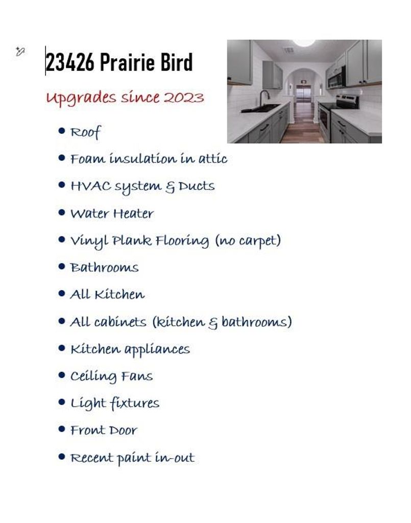 23426 Prairie Bird Dr is listed for sale at $ 195,000. The Single-Family property has 3 bedrooms, 2 Full Bathrooms, 1126 square feet and was built in 1982. The lot size is 6780 Square feet. ##BR##Experience comfort and modern living in this beautifully updated home situated on a spacious corner lot in Cypress Trails/Timber Lane. This residence boasts a comprehensive renovation, including a new roof, HVAC system, water heater, and energy-efficient foam insulation in the attic. Inside, you’ll find fresh paint, luxury vinyl plank flooring throughout, and a remodeled kitchen featuring new cabinets, countertops, and appliances. The open-concept living area is enhanced by high ceilings and a cozy wood-burning fireplace, creating an inviting atmosphere for relaxation and entertaining. The primary suite offers a tranquil retreat with a soaking tub and closet space. Enjoy outdoor living on the covered patio, perfect for gatherings or quiet evenings. Conveniently located near I-45, Hardy Toll Road, and George Bush Intercontinental Airport, with easy access to shopping, dining, and parks. This move-in-ready home has modern updates and QUALIFIES FOR A GRANT upt to 10k!