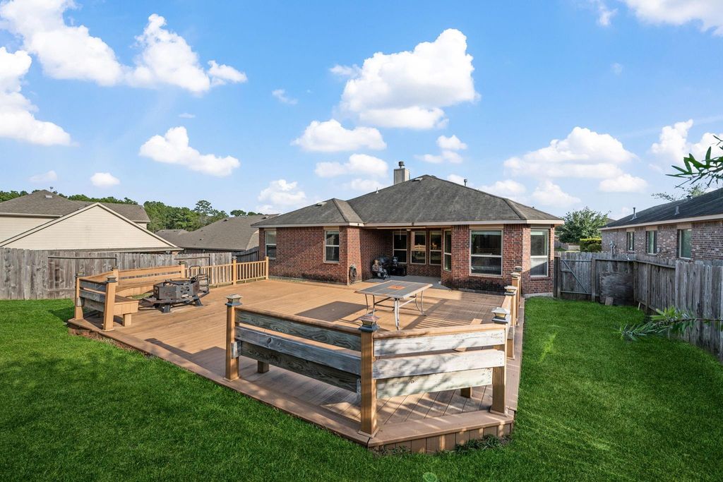 Well-maintained one-story home in Valley Ranch zoned to New Caney ISD offers convenient access to 59/69 and 99; make sure to check out the deck! Open flow floorplan allows easy transition between the living room with gas fireplace, home office/flex room, and kitchen with: gas range, granite countertops, and breakfast room. Spacious primary bedroom features en suite bathroom with: dual sink vanity, separate shower and soaking tub, private water closet, and walk-in closet. Fenced backyard is highlighted by generous sized deck, large enough for entertaining and cooking, with inset post lighting and bench seating. Neighborhood amenities include: sidewalks, pool, playground, park, clubhouse, pond, and trails. Close access to Valley Ranch Town Center, local shopping, dining, entertainment, and Randall Reed stadium.