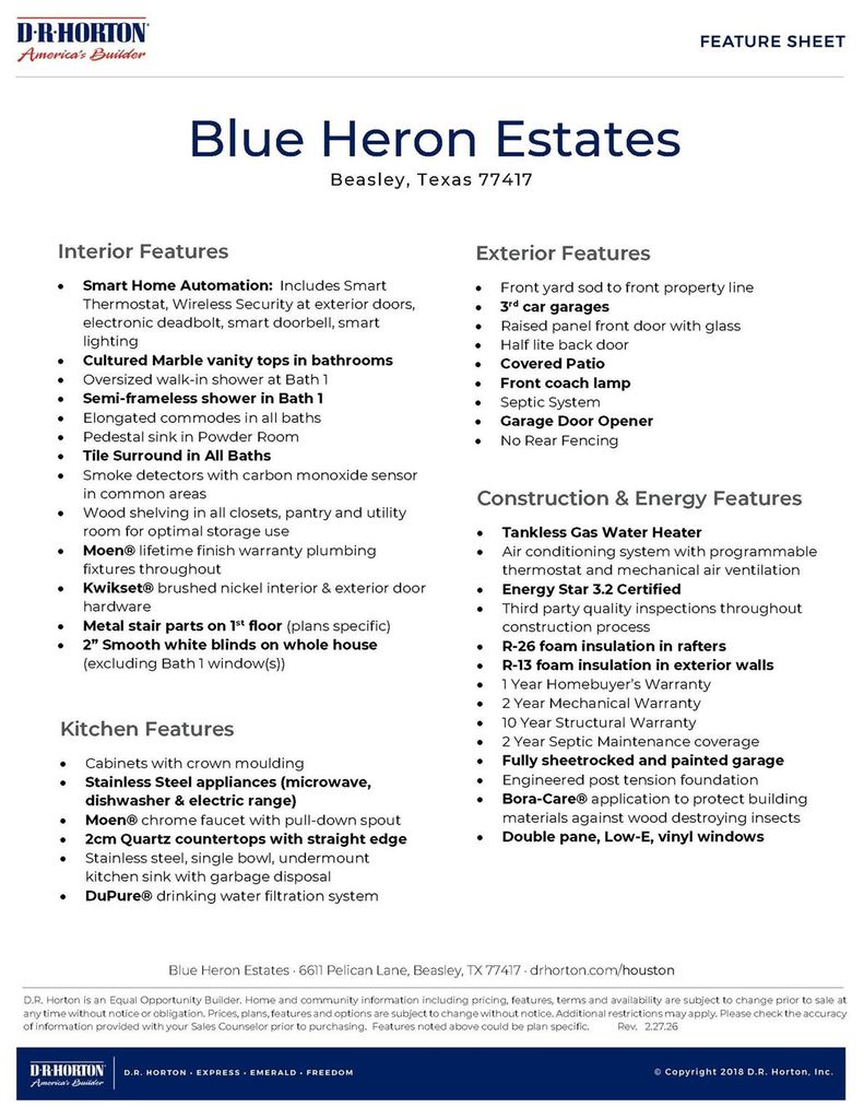 ESTIMATED COMPLETION DATE JUNE 2026. The Courtland plan, a single-story home offers 4 bedrooms, 3 full bathrooms, and a 3-car garage, all within 2,297 sqft. of thoughtfully planned living space. The open-concept layout features a modern kitchen with a large island, stainless steel appliances, a corner pantry, and a convenient breakfast bar. The kitchen seamlessly flows into the dining area and the family room, which opens to a covered patio. The primary suite is tucked away at the rear of the home, showcasing a walk-in closet and a luxurious bathroom with dual vanities and a standing shower. 3 secondary bedrooms, with one of the bedrooms offering a private en-suite bathroom. Additional highlights: spacious utility room, extra storage space, and direct access from the 3-car garage. Blue Heron Estates located at Beasley TX offers easy access to major highways and is just minutes from Brazos town center putting shopping, dining, and daily essentials right within reach.
