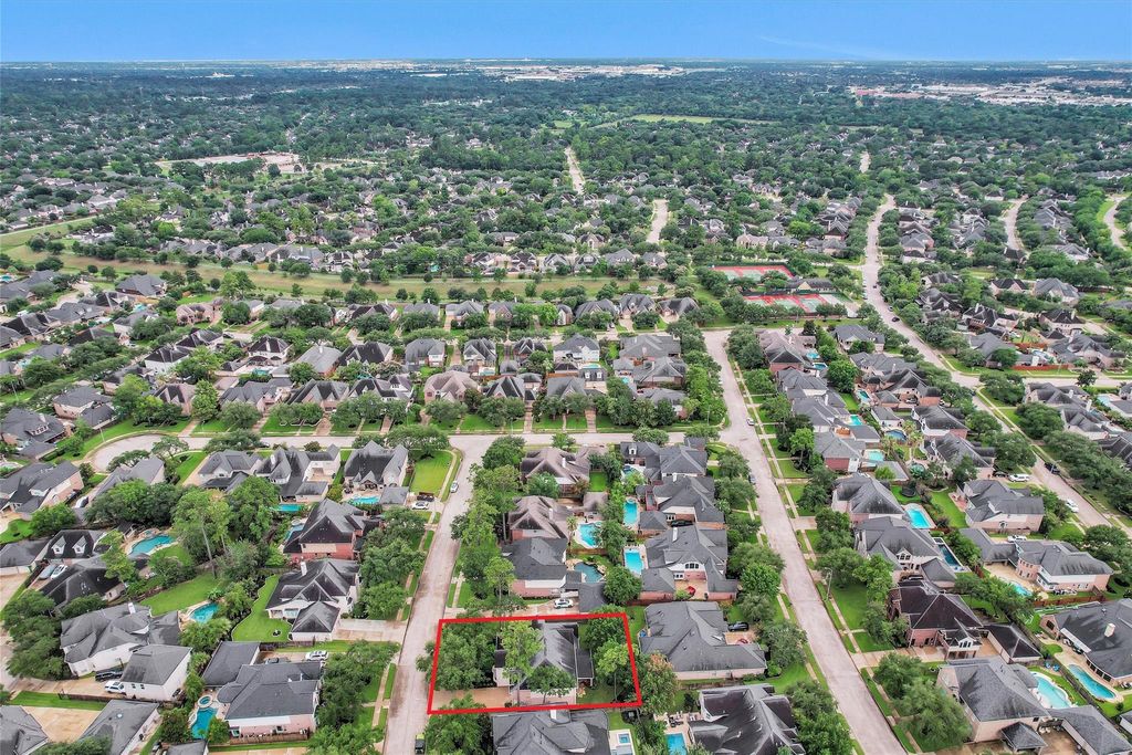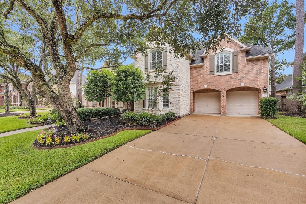 Elegant home with beautiful stone facade & welcoming covered front porch in a beautifully treed, quiet section of Coles Crossing. 2 story entry hall with wood flooring, art niches & Juliette balcony from above. Formal dining room with columns to left of entry has double French doors to front porch. Home office to the right has double glass door entry & bay window with Plantation shutters. Living room with gas fireplace, built-ins, soaring 2 story ceiling & wall of windows is open to kitchen & breakfast area. Central, island kitchen boasts a walk-in pantry, double electric wall ovens, ceramic electric cooktop & pot hanger. Primary suite downstairs with Grecian soaking tub, frameless glass shower & long vanity with 2 sinks. 2 guest powder rooms (1 up, 1 down). Upstairs comprises large game room with guest bathroom, 3 large secondary bedrooms & 2 more bathrooms. All carpeting replaced November 2025. 25x12 covered back patio. Solar screens on back. Tandem 3 car garage.