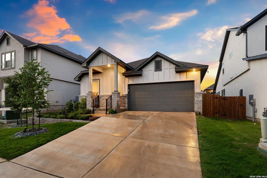 Welcome to this beautifully designed 2023 Chesmar home located in the highly desirable Meyer Ranch community. This single-story residence offers 1,852 square feet of thoughtfully laid-out living space, featuring 3 bedrooms, 2 bathrooms, and a dedicated flex space ideal for use as an office or another living space. The open-concept floor plan creates a seamless flow between the kitchen and living areas, perfect for both everyday living and entertaining. The chef's kitchen is equipped with a gas range, vent hood, granite countertops, and a spacious breakfast bar that opens directly to the living room. The living area is anchored by a cozy fireplace and filled with natural light. The primary suite offers a private retreat with an en suite bathroom featuring double vanities, walk-in shower, and a generously sized walk-in closet. Secondary bedrooms are well-positioned and provide comfortable space for family or guests. Step outside to enjoy a covered patio overlooking peaceful Hill Country