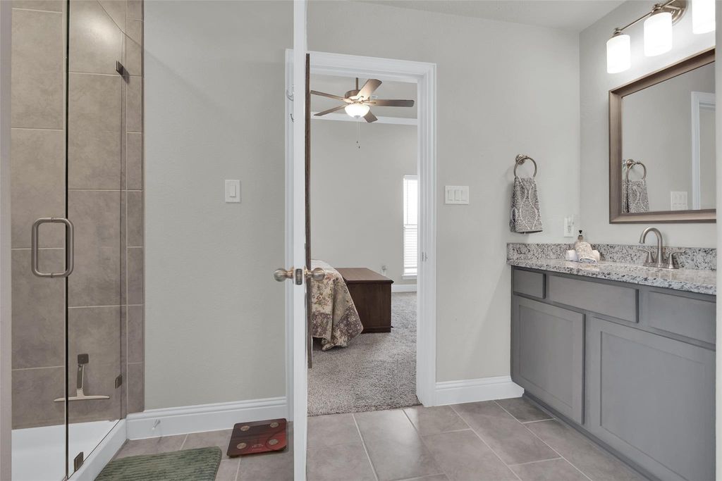 The primary suite includes a spacious walk-in closet with direct access to the laundry area, enhancing convenience. Secondary bedrooms offer generous space along with ample closet storage. Additional interior features include ceiling fans in all rooms and cordless blinds throughout.