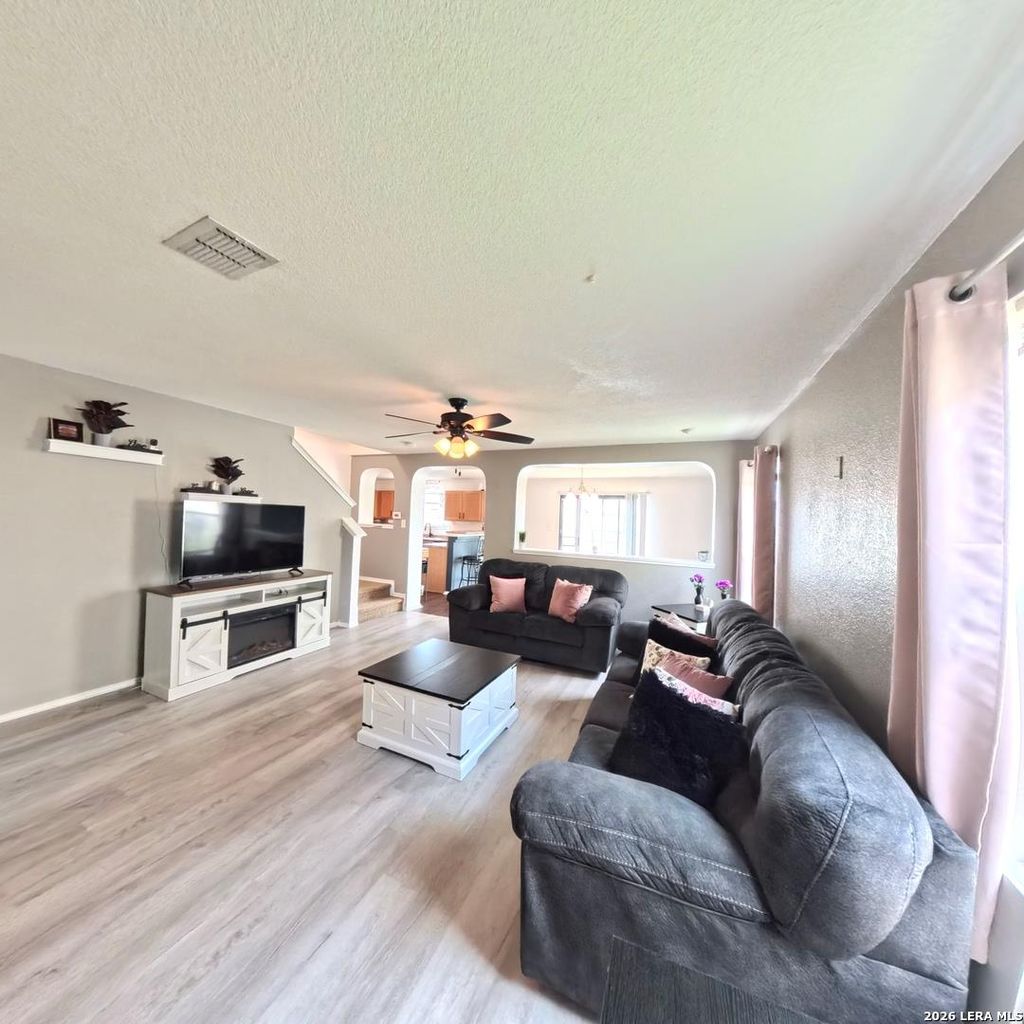 Experience a sanctuary perfectly positioned in the high growth 78245 zip code of West San Antonio. This meticulously maintained residence offers an ideal blend of designer aesthetics and functional luxury. As you enter, the front living room it showcases premium light wood laminate flooring that creates an immediate sense of modern elegance and warmth. The heart of this home is a large open kitchen designed for the culinary enthusiast. Bathed in natural light, the space features rich cabinetry paired with lovely granite inspired countertops. The seamless transition between the kitchen and the living areas makes this the perfect setting for hosting energetic weekend gatherings or enjoying quiet evenings at home. Escape to the massive 270 square foot primary suite located on the private second level. This oversized master bedroom serves as a genuine getaway from the city hustle. The upper floor also features two additional versatile bedrooms and a bonus room for entertainment or addition
