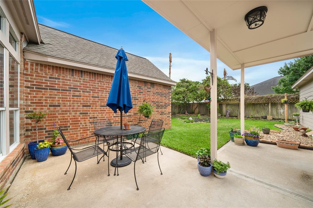 Nicely maintained 1-story home on a quiet street in Fairfield. Mature landscaping with full sprinkler system. Oversized detached garage is extra deep with room for storage and/or workshop area. Garage attic space is decked for additional storage. Fully fenced, private back yard. Excellent floorplan with spacious kitchen open to family room. Primary bedroom with en-suite bathroom at back of home. Secondary bedrooms & bathroom are tucked back on their own hallway. A/C replaced 2014. Exterior painted 2018. Beautiful wood-looking floor tiles installed 2018 in dining room, family room & primary bedroom. New carpet installed 2021 in secondary bedrooms. Kitchen cabinets painted in 2021. Kitchen granite countertops and tile backsplash installed 2021. Fairfield has miles of walking trails, 6 different pools, several sports & recreational facilities, and an excellent gym. Quick access to shopping, dining, and entertainment. Top-rated Cy-Fair schools. This home has never flooded.