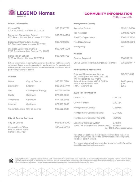Welcome to one of Legend's newest communities in Conroe, TX! Conveniently located off the 336 Loop, Cliffstone Hills makes commuting a breeze! The Canyon floor plan is a spacious 2-story home with 3 bedrooms, 2.5 baths, and 2-car garage. The first floor offers the perfect space for entertaining with the kitchen open to both the living and dining areas and vinyl plank flooring throughout! The gourmet kitchen is sure to please with 42" cabinets and granite countertops! Upstairs offers a private retreat for all bedrooms! Retreat to the Owner's Suite featuring a Texas-sized walk-in closet! Enjoy the great outdoors with full sod, sprinkler system, and NO BACK NEIGHBORS! Don’t miss your opportunity to call Cliffstone Hills home, schedule a visit today!