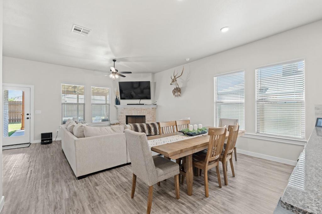This well-maintained home offers a spacious and functional layout with an open-concept living, kitchen, and dining area that flows easily for everyday living or entertaining. The kitchen features ample cabinet space and a large peninsula overlooking the living room, where a cozy corner fireplace serves as a focal point. The split-bedroom design includes two secondary bedrooms with great natural light and a shared bathroom, while the primary suite provides a private retreat with a soaking tub and a large walk-in closet. The backyard is one of the largest in the neighborhood and features a large patio with a pergola, an 8x14 shed, irrigated yard and flowerbeds, and plenty of space to relax or entertain, while the front yard offers turf and xeriscape for low-maintenance living. Clean, spacious, and in pristine condition, this home is move-in ready. Schedule your showing today!