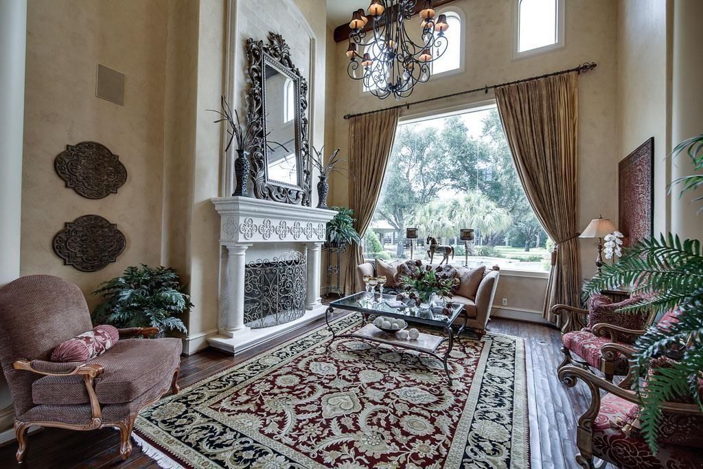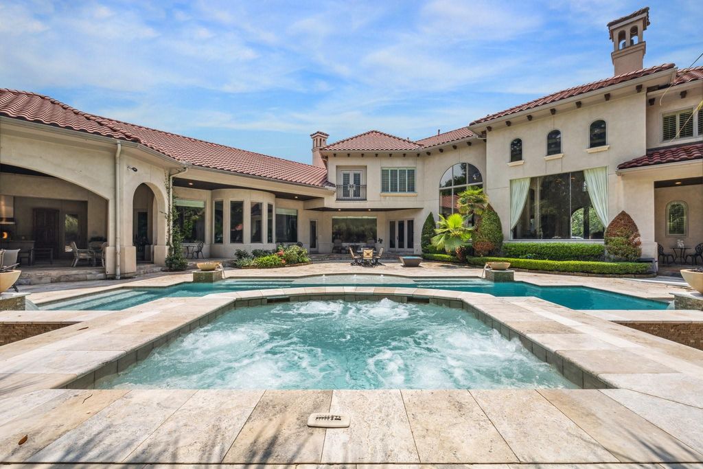 A magnificent estate, this Mediterranean-style residence was designed by Houston's acclaimed, Robert Dame. Its gated entrance and curving, elongated driveway introduce guests to the 4.55-acre, manicured grounds. The home with a grand reception hall and spacious, open living blends beautiful architecture with a comfortable lifestyle of today. The master wing includes a library/study with nineteen-foot ceilings, an exercise room, a luxurious bedroom with a fireplace and dual closets/dressing areas. The fully-equipped, gourmet kitchen is in the center of the home and has wonderful views of the front acreage. Three living areas are located on the first level and look to spectacular grounds which feature a luxury pool, summer kitchen, lighted pavilion with a sports court, and a putting green shaded by beautiful, old oak trees. The property also includes two additional access gates for convenience and ease in entertaining. Amenities are endless to accommodate various lifestyles.