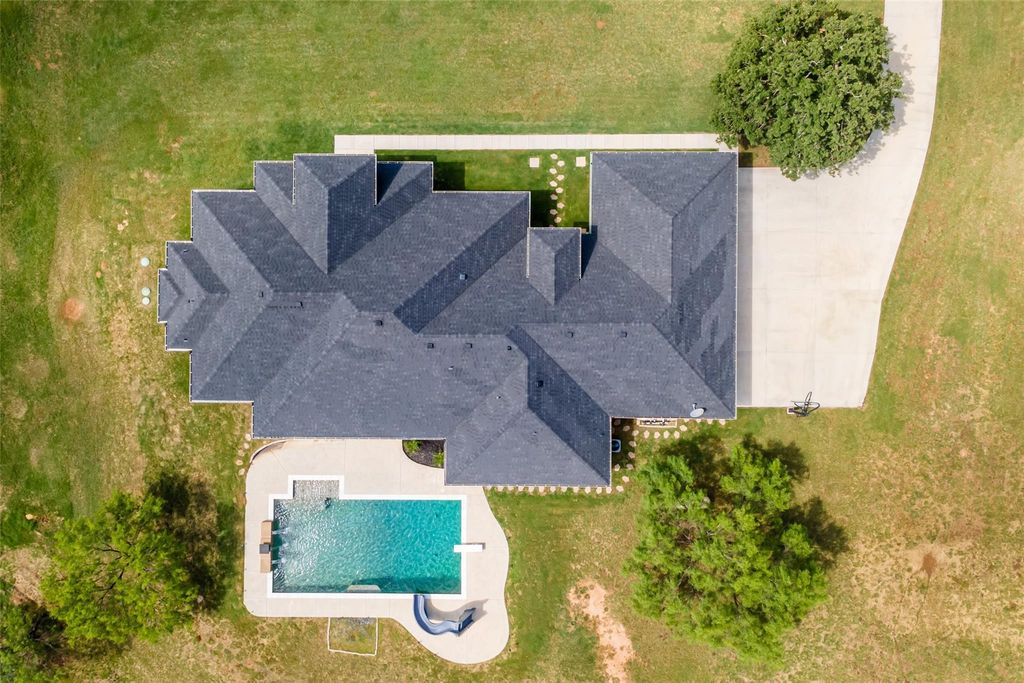 GORGEOUS CUSTOM HOME IN BROCK ISD WITH NO CITY TAXES & NO HOA on almost 4 acres with a pool and a pond! This is the perfect home for those that want some extra space, and outdoor amenities for the kids to enjoy! Beautiful open floor plan with a large family room with a fireplace, and a huge kitchen with tons of cabinets (with pullouts) and countertop space! Eye catching quartz countertops with stainless appliances! Wonderful split bedroom arrangement with a sizeable master overlooking the large salt water pool! Pristine master bath with walk in shower from both sides! The home features its own private stocked pond with catfish, bass, and bait fish, 2 dishwashers, an extra washer-dryer for the jack & jill baths, drying racks in the utility room, fiber internet, a second front entrance and mud room, and a large storge closet for Christmas decor or other items. There is a storage garage, and the 3 car carport could easily be enclosed. Good blown in and radiant barrier insulation. ABSOLUTELY GORGEOUS!