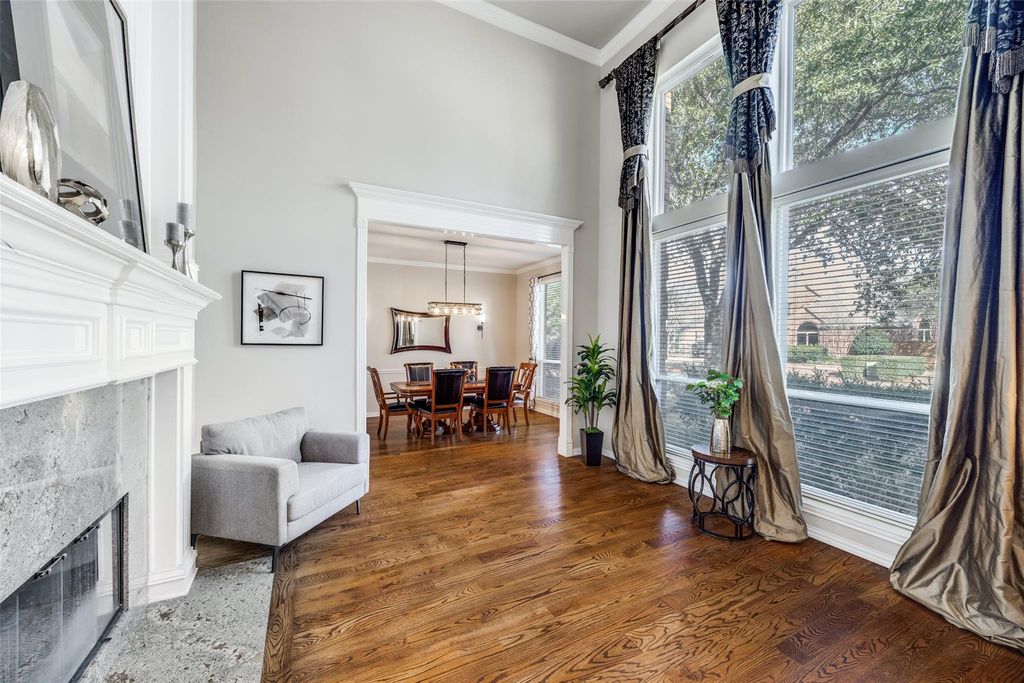 Stunning Huntington two-story home with a sparkling pool and spa, beautifully updated with designer touches throughout. This light-filled residence features rich hardwood flooring, tall ceilings free of popcorn texture, and energy-efficient Low-E windows that enhance both style and comfort. A grand staircase and soaring two-story foyer make a striking first impression. An impressive private study showcases custom built-in wood bookcases and French doors, while the beautiful formal living area with gas fireplace flows seamlessly into the adjacent dining space—ideal for entertaining. The spacious kitchen is equipped with high-end stainless-steel appliances, including a gas cooktop, light granite countertops, custom cabinetry, and opens to both the breakfast area and den. The private backyard oasis offers a covered patio with an additional retractable patio awning, perfect for year-round outdoor living, along with an automatic gate providing a secure, private driveway. The updated interior includes all bathrooms, with the primary suite featuring a frameless shower and timeless, classic décor. All four generously sized bedrooms offer ensuite bathroom access, with 4th bedroom large enough for second primary suite. the upstairs game room is spacious enough for a pool table and additional entertainment space and has skylight. Ideally located near parks, walking trails, shopping, and excellent restaurants, this exceptional home is zoned to award-winning Coppell ISD , walkable to elementary school and offers the perfect blend of luxury, comfort, and location.
