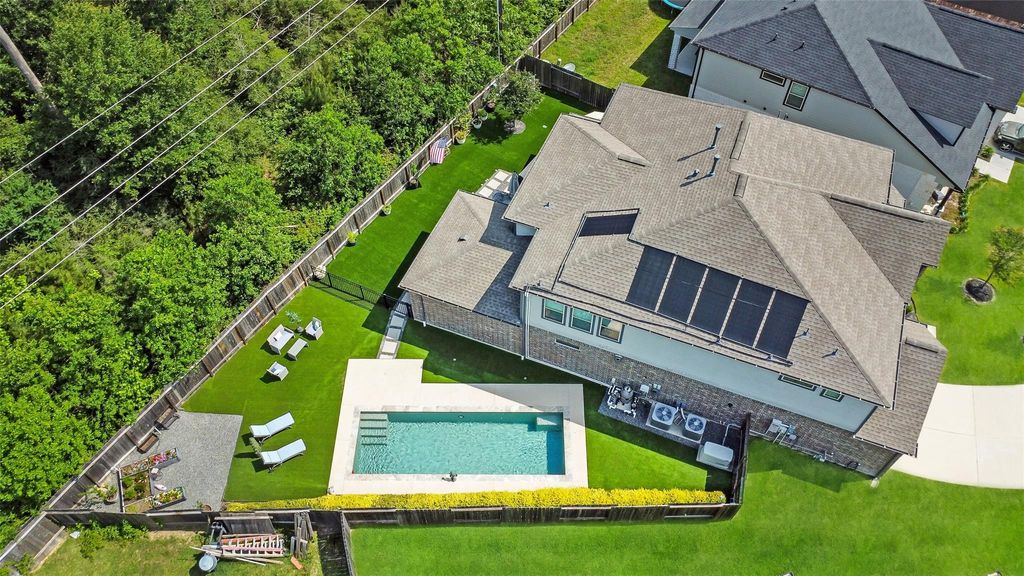 Stunning home with a pool! This two story home is situated on an oversized lot with no back neighbors & offers a well-designed layout with 4 bedrooms, 3.5 baths, a gameroom & a dedicated media room. The open-concept living area features soaring ceilings, a cast stone fireplace & a wall of windows that fill the space with natural light. The kitchen is equipped with double ovens, 42" cabinetry, abundant storage, a center island, walk-in pantry, breakfast bar & a bright breakfast nook. The spacious primary suite is tucked away on the 1st floor. Walk-in closets in all bedrooms. Step outside to your private backyard oasis featuring a sparkling pool, patio, hot tub & low-maintenance turf. Whole-home Generac generator is included! Full sprinkler system. Convenient location with easy access to I45, Grand Parkway & Hardy Toll Road.