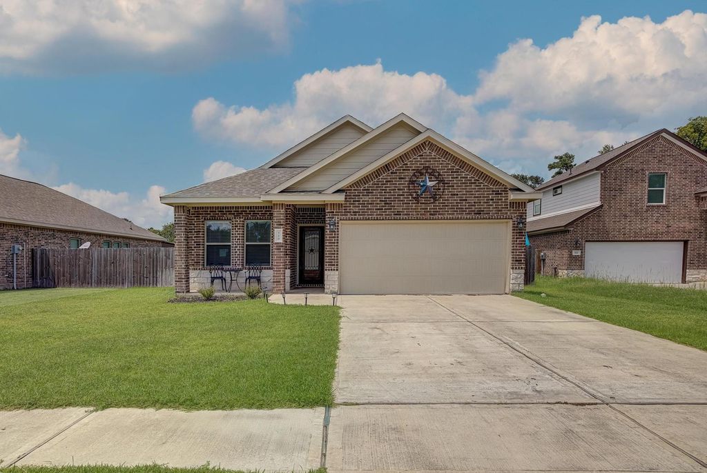 Welcome to this immaculately maintained home with upgraded features including a premium covered patio, custom shiplap wall with electric fireplace, and modern kitchen with quartz countertops. The spacious open layout offers 4 bedrooms, dual sinks in both bathrooms, and vinyl plank and tile flooring throughout. Fresh, neutral colors create a welcoming atmosphere. Washer, dryer, and refrigerator are included. Not in a flood zone. Don't miss this gem!