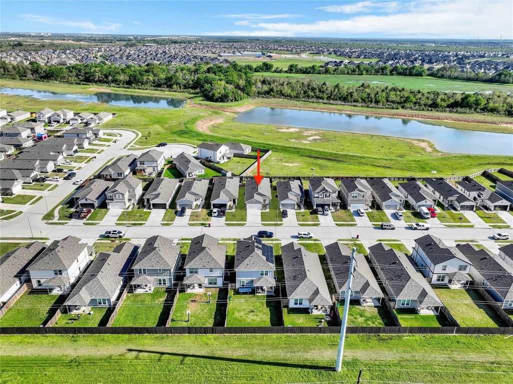 Welcome to 23823 Escardilla Dr of Hockley, a wonderful lake view home. The home is move-in-ready 3-bedroom, 2-bath & an office or 4th bedroom, located on a lake lot and NO REAR NEIGHBOR.. Built in 2024, this single-story home features a bright, open-concept layout with high ceilings and modern finishes. The kitchen is equipped with granite countertops, stainless steel Whirlpool appliances (including a 5-burner gas range and built-in air fryer), 42” cabinets, and a large island perfect for cooking and gathering. The primary suite includes a walk-in closet and ensuite bath with dual vanities, while two additional bedrooms offer flexibility for family or home office use. Enjoy a covered patio, fully fenced backyard, and access to excellent community amenities including a pool, playgrounds, basketball court, and dog park. Located near Hwy 290 and zoned to Waller ISD, this home combines comfort, functionality, and convenience in one great package.