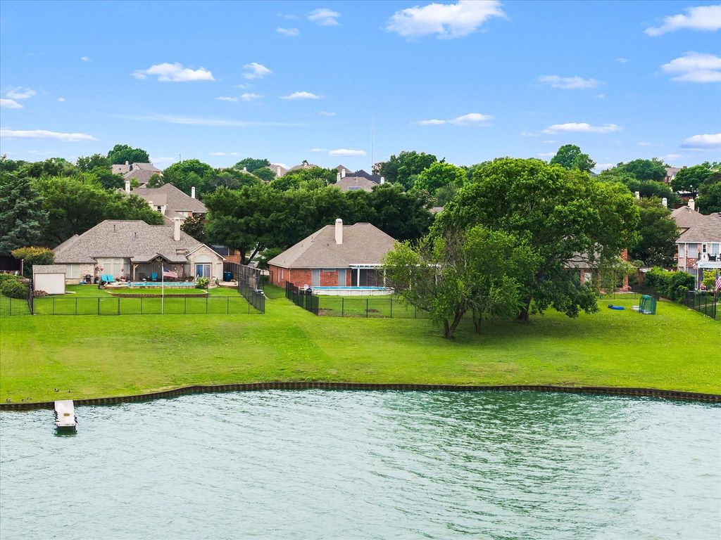 Lovely one-story lakefront home with a sparkling pool and the rare opportunity to build your own private boat dock—perfect for embracing true lakeside living. Mature trees enhance the home’s curb appeal, creating a warm and inviting first impression. The entry features soaring ceilings and opens to a spacious home office and dining room, ideal for hosting family gatherings and special occasions. The open-concept floor plan offers seamless flow and abundant natural light throughout. The beautifully updated kitchen is a chef’s dream, showcasing expansive custom cabinetry, granite countertops, a marble backsplash, and built-in appliances including a range, microwave, and dishwasher. A convenient breakfast bar overlooks the breakfast area and the inviting family room. The stunning family room is anchored by a beautiful fireplace and offers breathtaking lake views, creating the perfect space to relax or entertain. Step outside to the expansive covered patio, ideal for outdoor living and entertaining, all while enjoying views of the large fenced backyard and refreshing pool. The serene primary suite features picturesque lake views and a spa-inspired ensuite bath, complete with luxurious finishes and a spacious walk-in closet. Three additional bedrooms offer ample closet space and flexibility for family or guests. Work from home with ease in the dedicated study. A two-car garage and extended driveway provide plenty of parking for family and visitors. Whether you're looking for a weekend retreat or a full-time residence, this exceptional property offers the very best of lakefront living. This is a must see!
