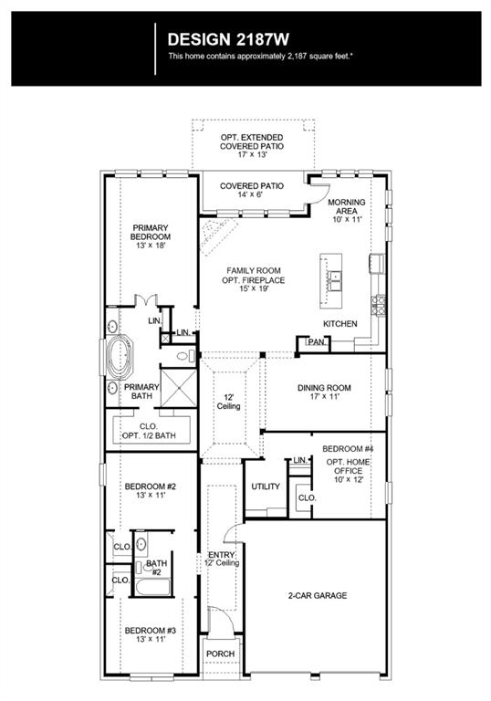 Extended entry with 12-foot coffered ceiling leads past formal dining room to open family room, kitchen and morning area. Family room features wall of windows. Kitchen features generous island with built-in seating space and a 5-burner gas cooktop. Primary suite includes double-entry to primary bath with dual vanities, freestanding tub, separate glass-enclosed shower and large walk-in closet. All secondary bedrooms feature walk-in closets. Extended covered backyard patio. Two-car garage.